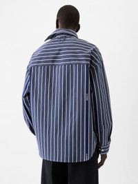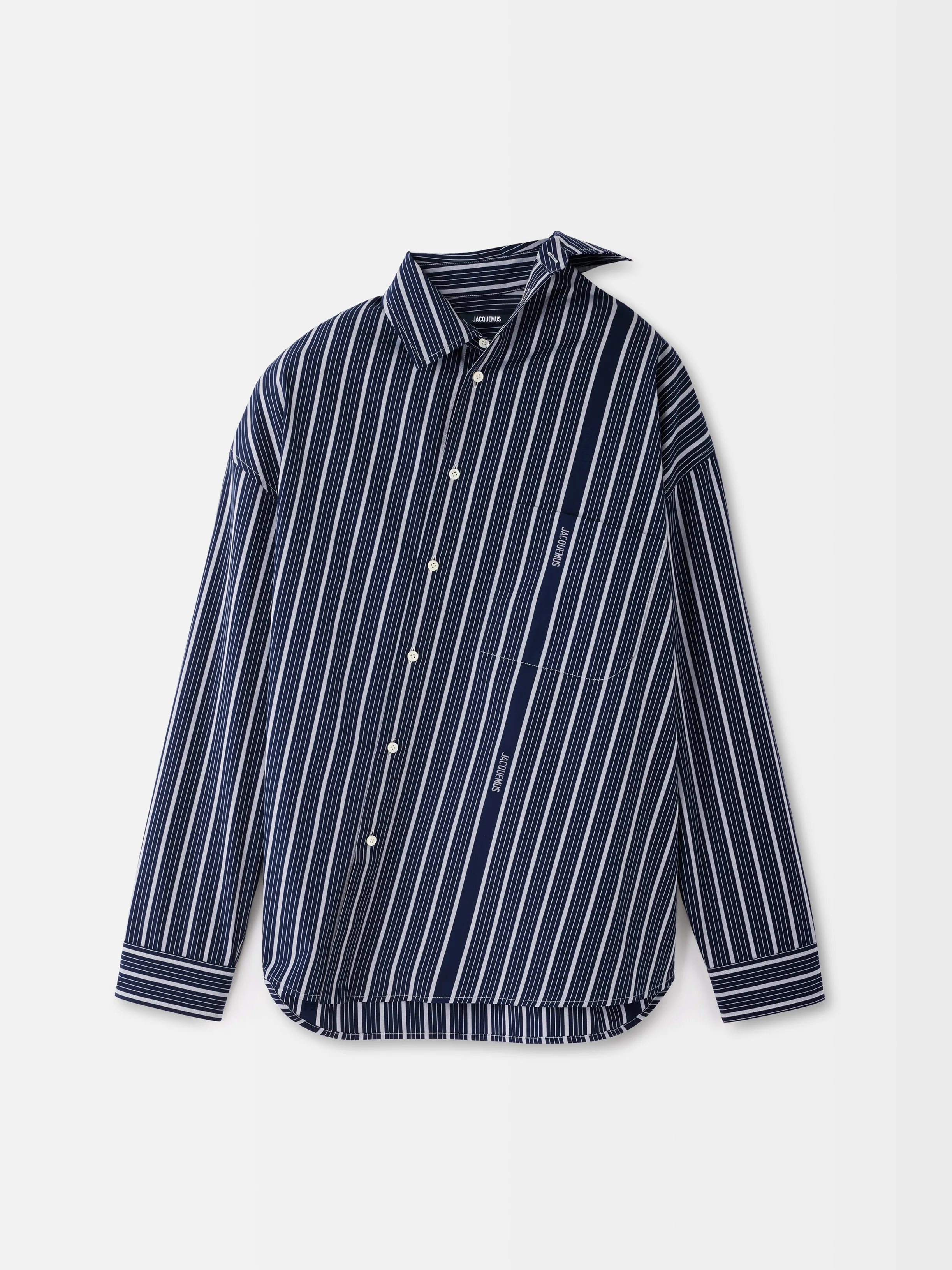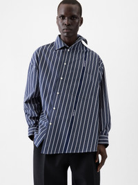 Asymmetric Business-striped shirt - Asymmetric oversized fit - Cotton jacquard with Business logo stripes - Asymmetric pointed collar - Asymmetric button placket - Long sleeves - Buttoned cuffs - Asymmetric "J" shaped chest pocket - “J" loop in the back - Back yoke - Mother-of-pearl buttons The model is 187cm and wears a size 48 100% Cotton Made in France Ref. SHM00537AW004943EQ