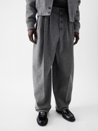 High-waisted buttoned pants - High-rise - Compact heathered wool - Long and wide curved leg - Double pressed-pleats - Visible buttoned fly - Side-seam pockets - Belt loops including a "J" loop - Buttoned flap pocket in the back - Horn buttons The model is 187cm and wears a size 48 Made in Bulgaria Ref. PAM00133BW00668970