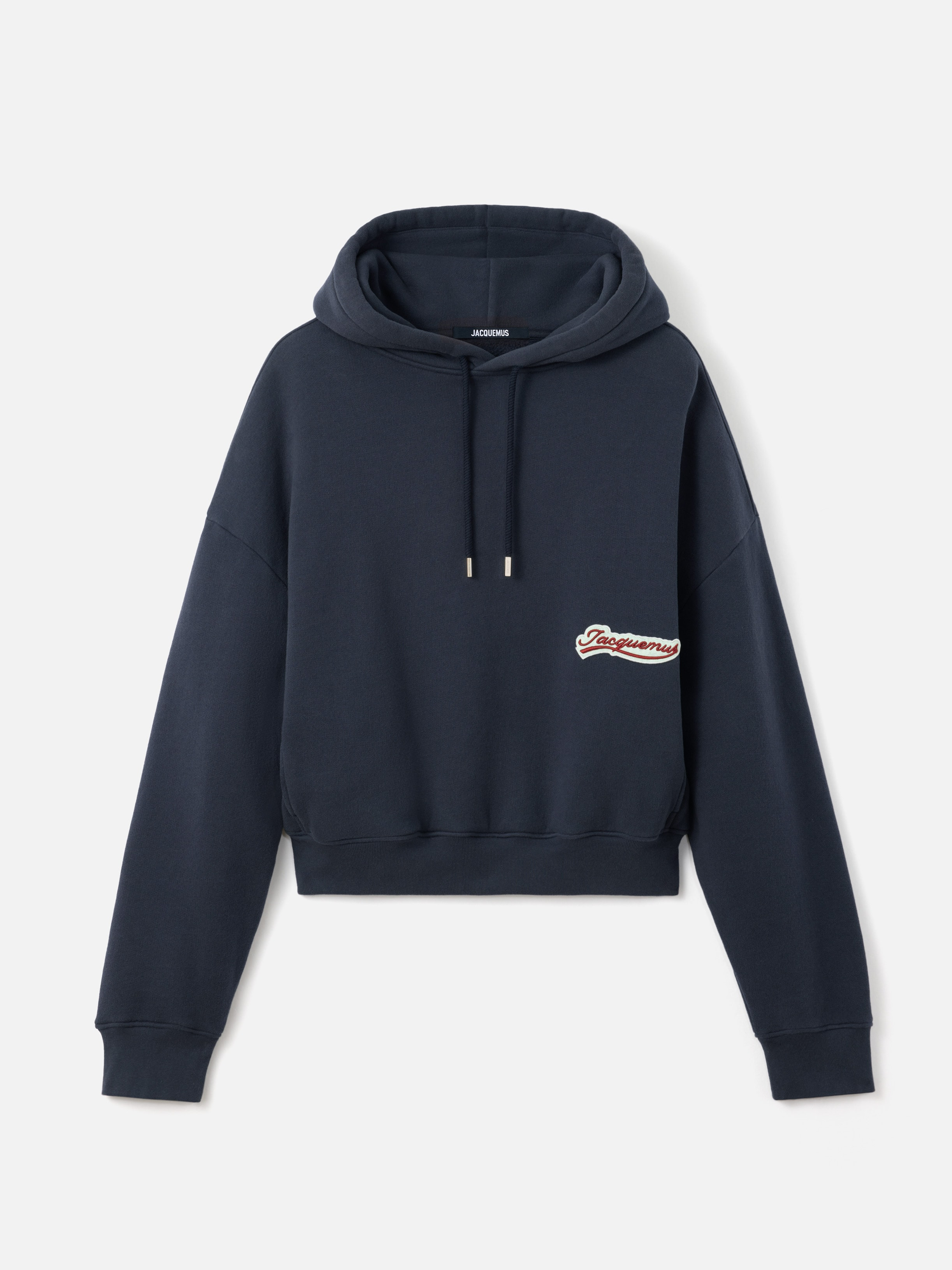 Hoodie with embroidered patches - Loose fit and long sleeves - Length above hips - Hood with adjustable drawstrings - Engraved round-square metal tips - Ribbed cuffs and hem - Contrasting embroidered "JACQUEMUS" patch on left side - Embroidered "J" patch on back The model is 189cm and wears a size M 100% Cotton Made in Portugal Ref. HOM00415AJ001263GH