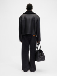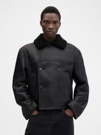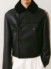Short shearling pea coat - Straight fit - Leather exterior and soft fleece interior - Shearling collar - Long sleeves - Double-breasted - Large welt pockets - Back and front yoke - Embroidered Calisson patch with logo on lower left sleeve - Corozo buttons The model is 187cm and wears a size 48 100% Sheepskin / Lining: 100% Cotton Made in Turkey Ref. 255CO059-1664-990