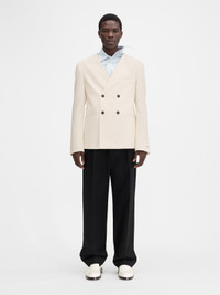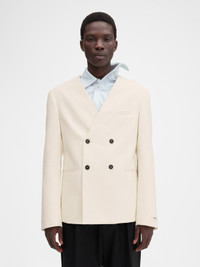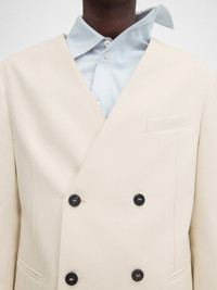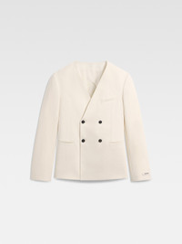 LA CROISIERE Double-breasted collarless blazer - Boxy straight fit - Cotton blend - Structured shoulders - Collarless - Double-breasted - Welt pockets - Interior welt pocket - Crocodile-embossed corozo buttons - Calisson grosgrain patch with logo at bottom of sleeve - Half lined The model is 187cm and wears a size 48 100% Cotton / Lining: 55% Cotton - 45% Polyester Made in Portugal Ref. 255JA063-1706-110