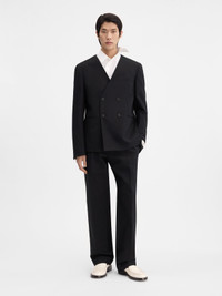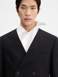 Double-breasted collarless blazer - Boxy straight fit - Cotton blend - Structured shoulders - Collarless - Double-breasted - Welt pockets - Interior welt pocket - Crocodile-embossed corozo buttons - Calisson grosgrain patch with logo at bottom of sleeve - Half lined The model is 185cm and wears a size 48 100% Cotton / Lining: 55% Cotton - 45% Polyester Made in Portugal Ref. 255JA063-1706-990