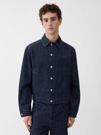 Short denim jacket - Short straight fit - Soft denim jacquard with loose thread effect - Pointed collar - Engraved metal buttons - Buttoned cuffs - Two welt pockets - Silver metal hardware - Contrast stitching The model is 189cm and wears a size 48 97% Cotton - 3% Polyamide / Lining: 65% Polyester - 35% Cotton Made in Italy Ref. OUM00155AD00054380