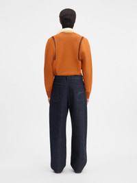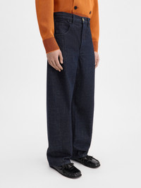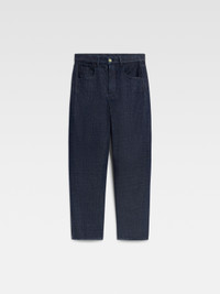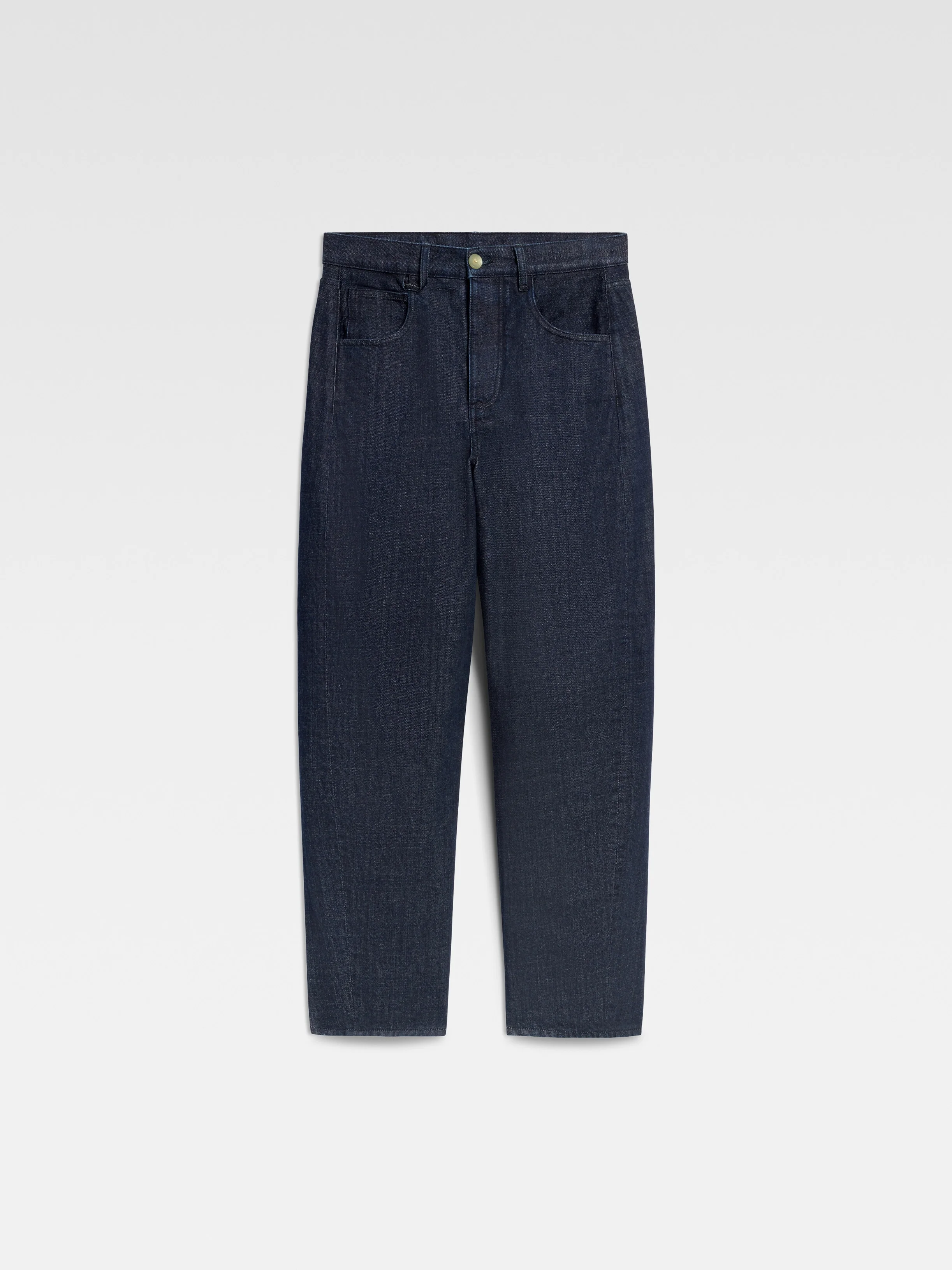 Curved jeans - Mid-rise - Dark navy cotton denim - Long curved leg - Five pockets - Buttoned fly - Contrast corozo buttons - “J" belt loop - Embroidered patch on the back - Laser printed 50s signature logo The model is 192cm and wears a size 30 100% Cotton / Lining: 65% Polyester - 35% Cotton Made in Portugal Ref. 255DE053-1782-390