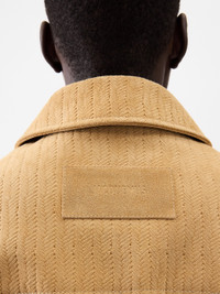 Woven leather jacket - Boxy fit with rounded shoulders - Embossed leather with bonded neoprene - Workwear collar - Long rounded sleeves - Horn button placket - Welt side pockets - Yoke on the front and back - Back pleats - Embossed logo patch on the back The model is 187cm and wears a size 48 100% Lamb Leather / Lining: 52% Viscose - 48% Cotton Made in France Ref. OUM00134AC09A11150