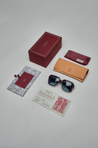 Rectangular sunglasses featuring a dark maroon frame with gradient blue lenses. The temples showcase a decorative metallic strip, adding a stylish flair. Materials: 100% Titanium, 100% Acetate Color: wine denim gradient SKU: 154744 Brand style: ALFRED
