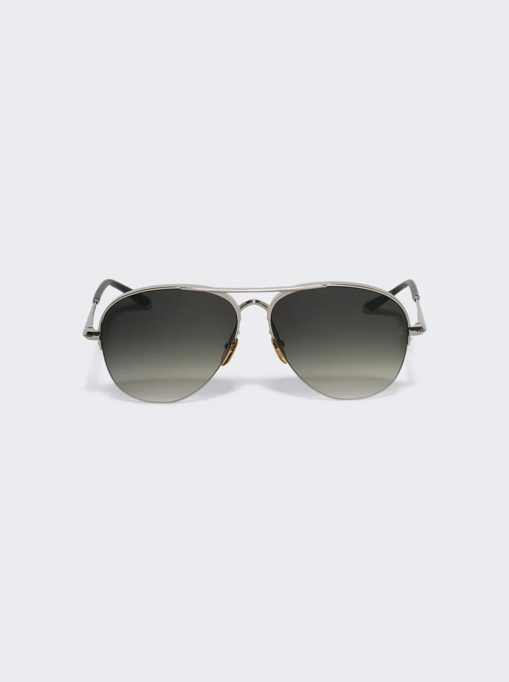 Details - Silver-finished 100% Beta Titanium frame - Green cured cellulose acetate temple sleeves - Green gradient lenses with backside anti-reflective treatment - 100% UV protection - Temple length: 144mm - Frame total width: 139mm - Lens width: 46mm - Lens height: 40mm - Bridge: 23mm Semi-rimless titanium aviators with a medium fit. They have an arched double-bridge with hairline details and Art Deco-inspired acetate temple tips with domed, hand-painted epoxy details. Vendor Color Code: Brand Style: J-ESN-TV-S301N-OS Designer/Brand: JACQUES MARIE MAGE