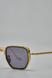 Gold-tone metal frames and dark grey tinted lenses. The lenses feature a geometric rounded-square shape with a contrasting black inner rim and textured outer edge. Thin curved temples, adjustable nose pads, and small red temple tips complete the design. Materials: 100% Acetate Color: silver SKU: 153212 Brand style: j-esn-tk-s4040
