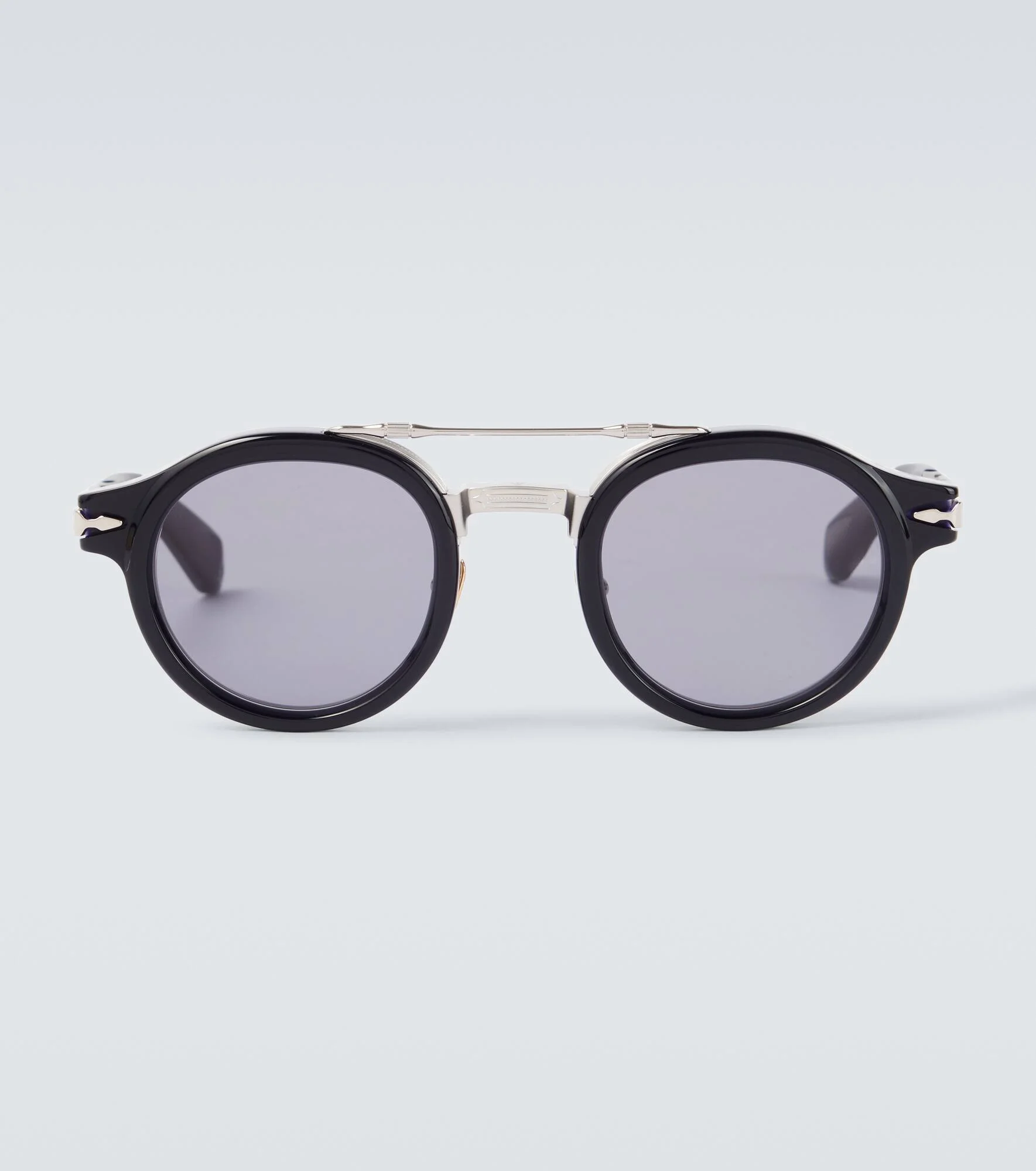 Drawing inspiration from an eclectic mix of art movements, Jacques Marie Mage crafts eyewear that serve as collectible objet d'arts. The Delage sunglasses feature ‘50s-inspired round frames and engraved titanium temples and arms. Product Details - Frame material: titanium, acetate - Frame color: blue, silver - Lens filter category 2 - Color: silver - Lens color: blue - Made in Japan - Includes: case and presentation box - The color of the case may vary - Item number: P01141449 Size & Fit - Lens width: 45mm-1.75" - Bridge size: 25mm-1" - Earpiece length: 145mm-5.7"