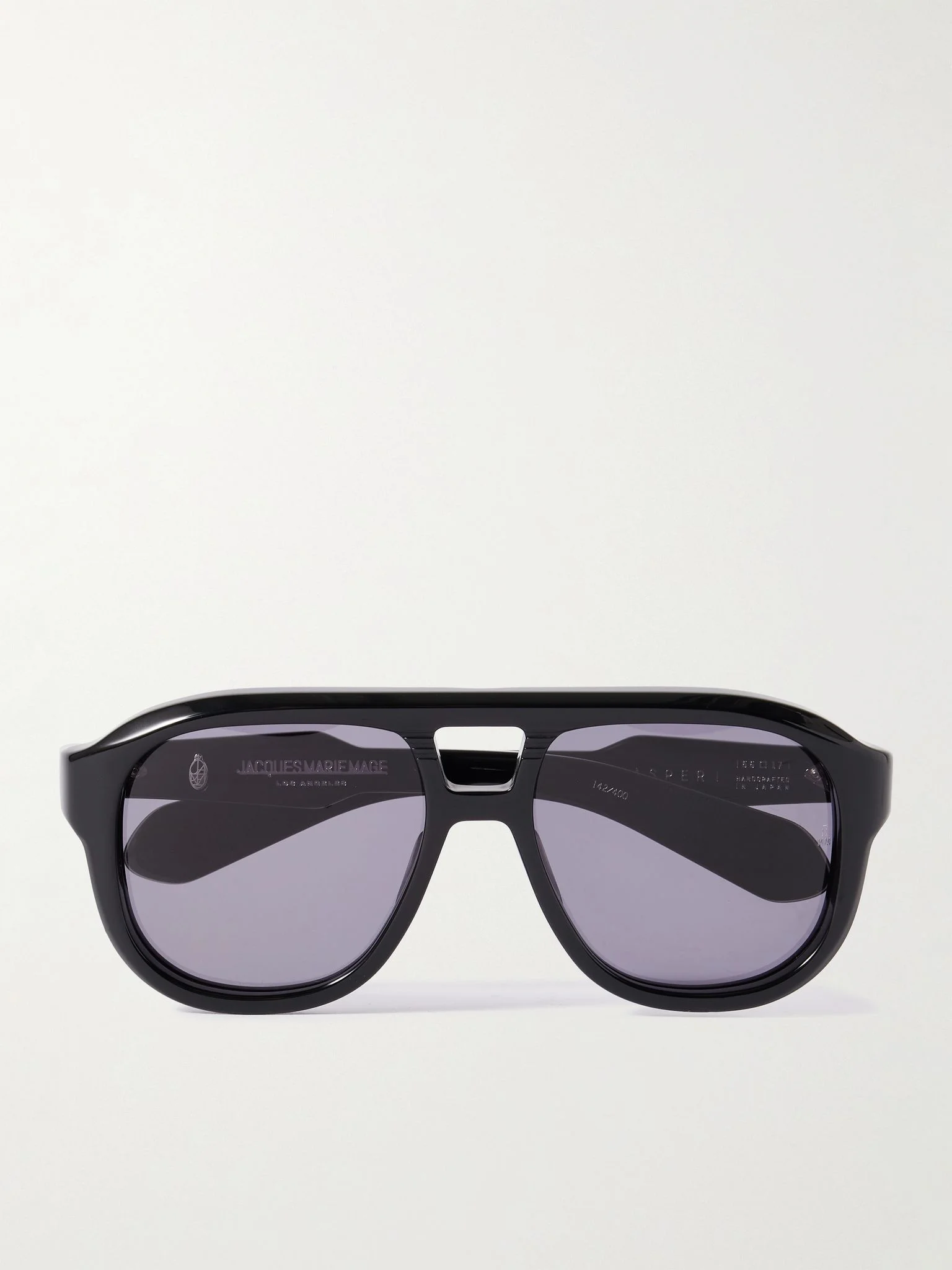 Each of Jacques Marie Mage's sunglasses is produced in limited quantities of 150, so every pair can be made with the utmost care and precision. Inspired by aviator styles from the 70s, these frames are handcrafted from 8mm cured acetate with a curved brow that wraps your face just slightly. They have stainless steel hinges and exposed wirecores along the arms. Details & Care - Black acetate - Come with a case - 100% UV protection - Limited to 150 pieces