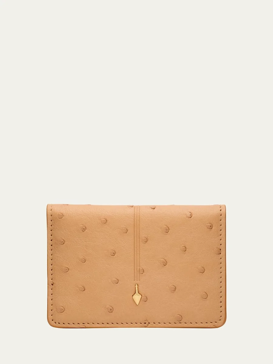 Jacques Marie Mage "Cassandre" bifold wallet in genuine ostrich leather Goldtone arrowhead adornment Two cards slots Two slip pockets Handpainted edges Art deco hairline debossed detailing Leather lining Approx. 3"H x 4.2"W Made in Italy