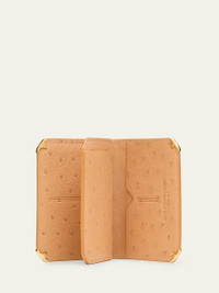 Jacques Marie Mage "Elston" trifold wallet in genuine ostrich leather Features 24karat goldplated Arrowhead corner adornments Four cards slots One discreet foldedbill pocket Handpainted edges Debossed crest logo Leather lining Approx. 3"H x 4.2"W Made in Italy