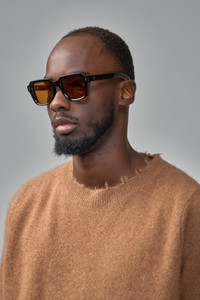 A pair of sunglasses features a dark frame with orange tinted lenses. The temples showcase a brown, wood-like finish with visible brand lettering on the inner side. These shades offer a stylish and practical accessory for sun protection. Materials: 100% Acetate, 100% Titanium Color: sterling SKU: 150421 Brand style: J-ESN-RT-S6010A-OS