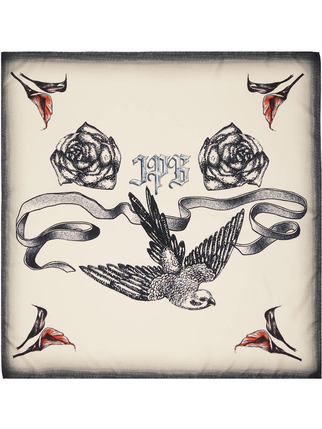 Beige & Black 'The Tattoo Bird' Printed Silk Scarf