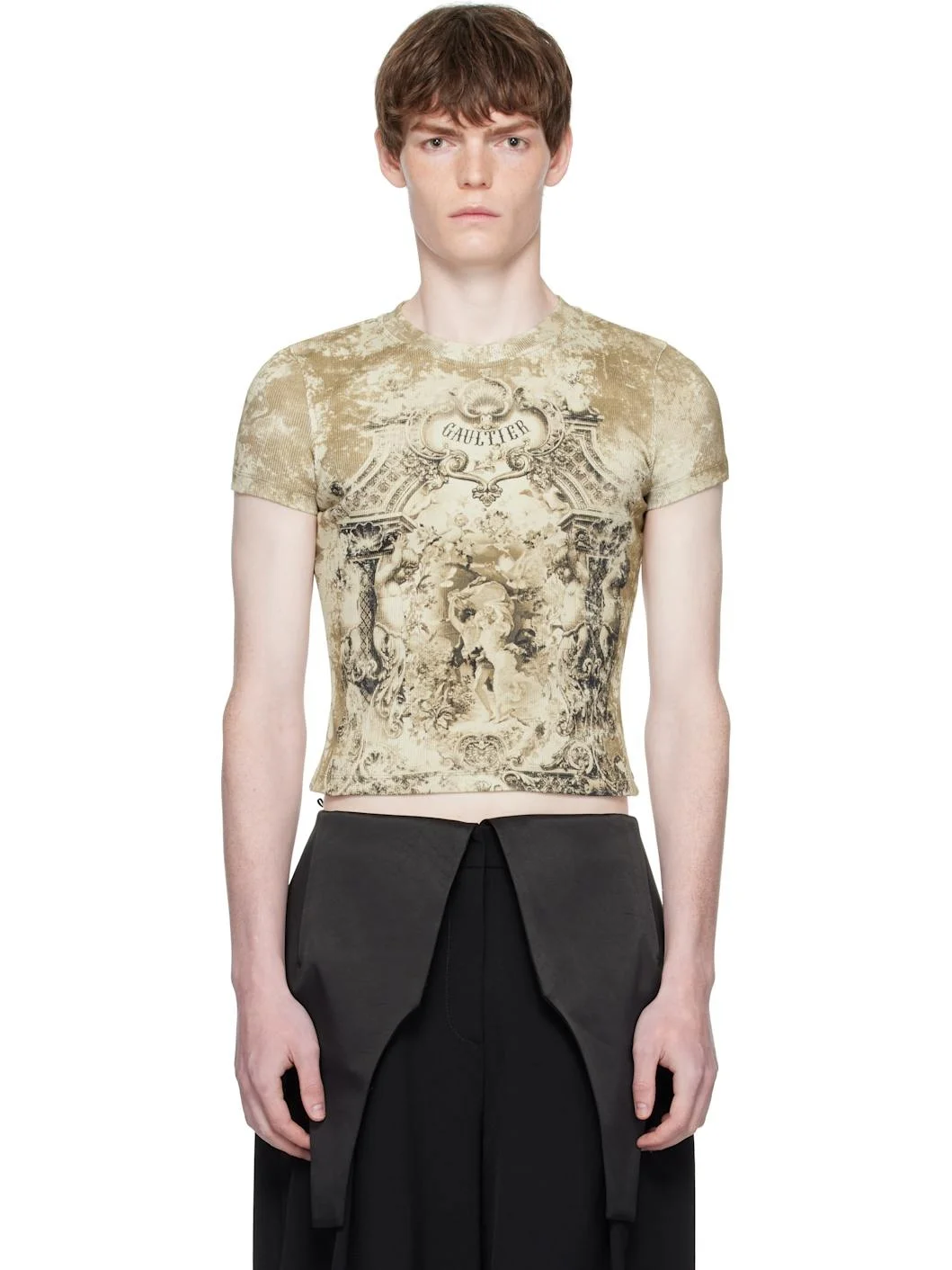 Rib-knit stretch cotton T-shirt. · Graphic pattern printed throughout · Crewneck · Logo printed at chest and back · Locker loop at back collar Supplier color: Beige 96% cotton, 4% elastane. Made in Portugal 252808M213012