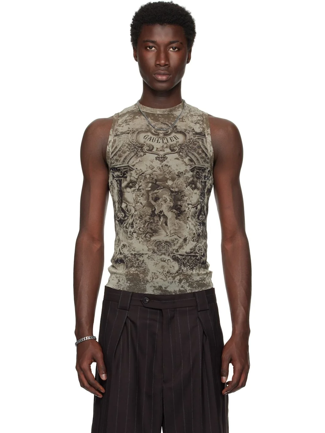 Semi-sheer nylon mesh tank top. · Graphic pattern printed throughout · Crewneck · Logo printed at chest and back · Locker loop at back collar Supplier color: Light beige/Taupe 100% polyamide. Made in Italy 252808M214007