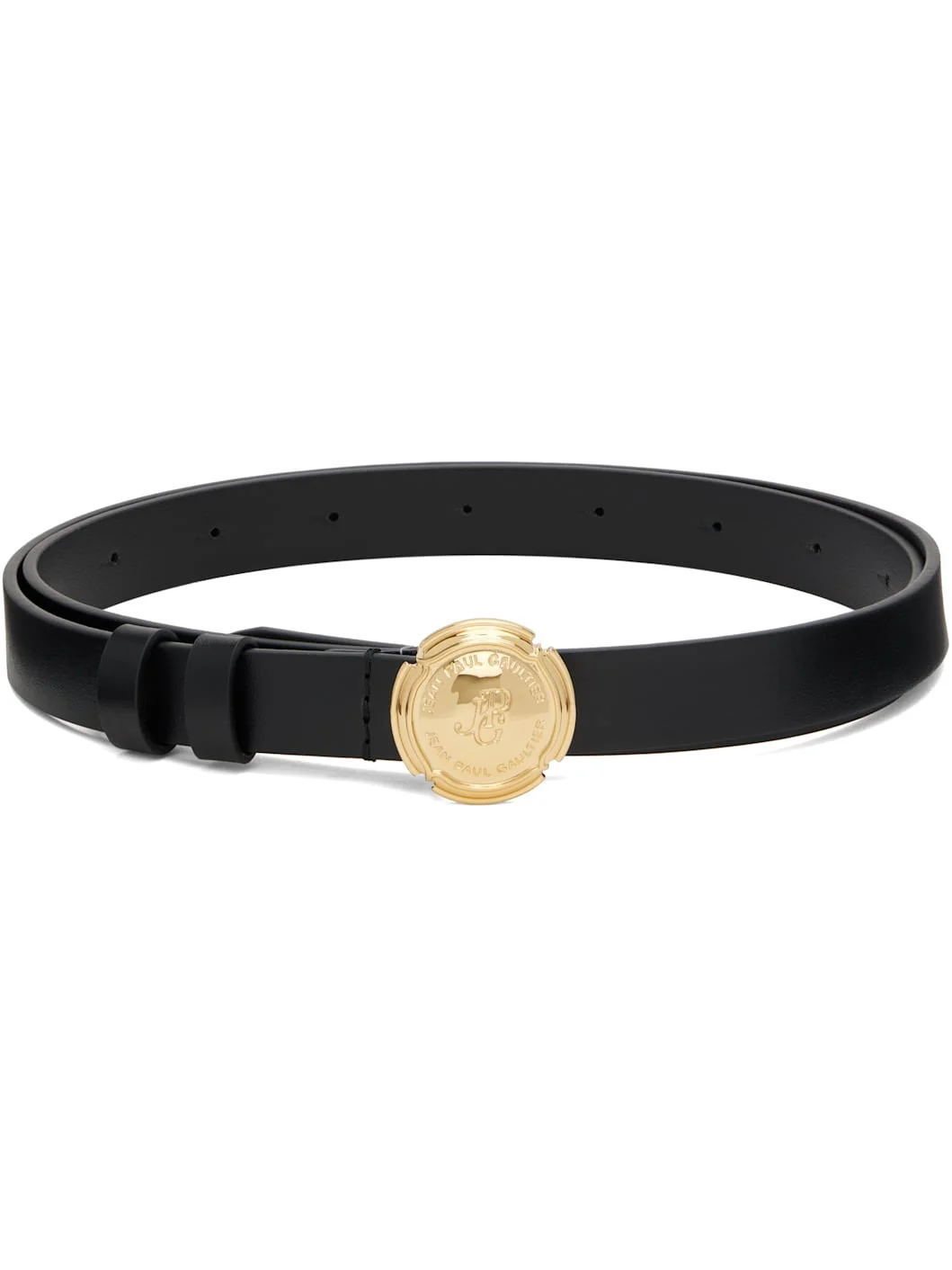 Buffed calfskin belt. · Keeper loops at length · Graphic hardware at post-stud fastening · Logo-engraved gold-tone hardware · W0.75" Supplier color: Black Calfskin. Made in Italy 252808M131000