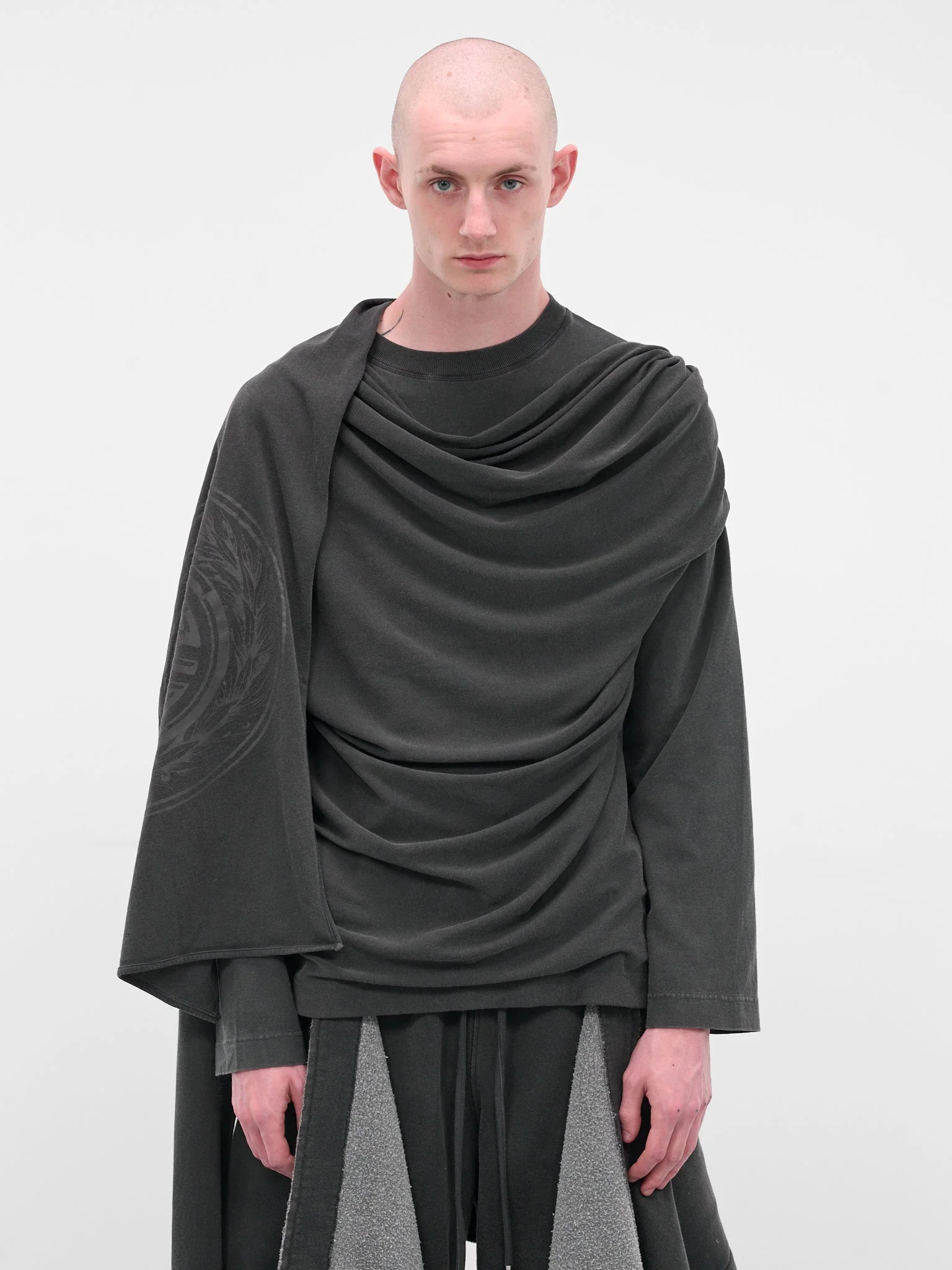 A black deconstructed T-shirt featuring a draped scarf embellishment with a printed logo at the draping. Designed with a crewneck, long sleeves, and a relaxed silhouette. Featuring: • Relaxed fit • Cotton construction • Deconstructed design • Washed dye • Draped scarf embellishment with logo print • Crewneck • Long sleeves • Made in Bulgaria • 100% Cotton • Standard sizing Model is 6'0" wearing size M. Shoulders: 17" Chest: 30" Waist: 28"