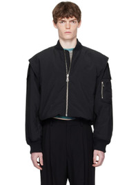 Insulated nylon-blend taffeta bomber jacket. Concealed zip expansion panel with stowaway hood at back. · Rib-knit stand collar and cuffs · Zip closure · Gussets at front · Press-stud seam pockets at waist · Cropped hem · Inset partial rib-knit hem · Dropped shoulders · Logo-embossed zip pocket at sleeve · Locker loop at back collar · Patch pocket at interior · Full satin lining · Logo-engraved silver-tone hardware Supplier color: Black Body: 52% polyamide, 48% polyester. Fill: 100% polyester. Lining: 100% polyester. Made in Italy 252808M175000