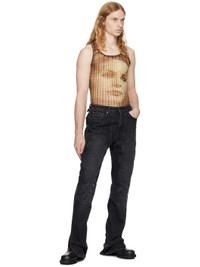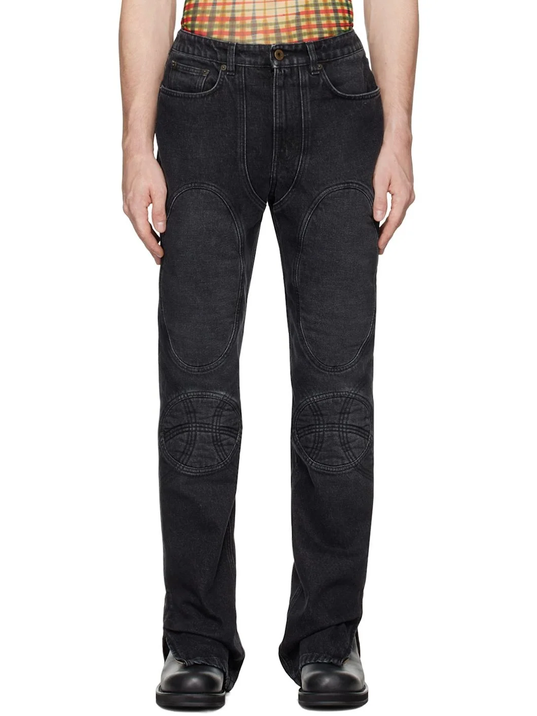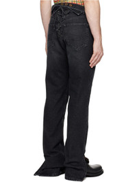 Straight-leg non-stretch denim jeans. Fading throughout. · Belt loops · Five-pocket styling · Zip-fly · Padded panels at legs · Zip vent at cuffs · Adjustable button strap at back waistband · Lace-up detailing at back · Logo-engraved antiqued gold-tone hardware Part of the Gaultier TV collection. Supplier color: Vintage black Body: 100% cotton. Lining: 65% polyester, 35% cotton. Made in Italy 242808M186017