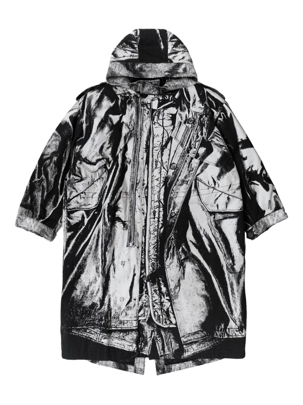 Trompe-print parka Highlights - Black and grey - Trompe l'oeil print - Hooded neckline - Half-length sleeves - Concealed zip fastening - Buttoned placket Imported Composition Cotton 100%, Viscose 100% Washing instructions Read Manufacturer Guidelines