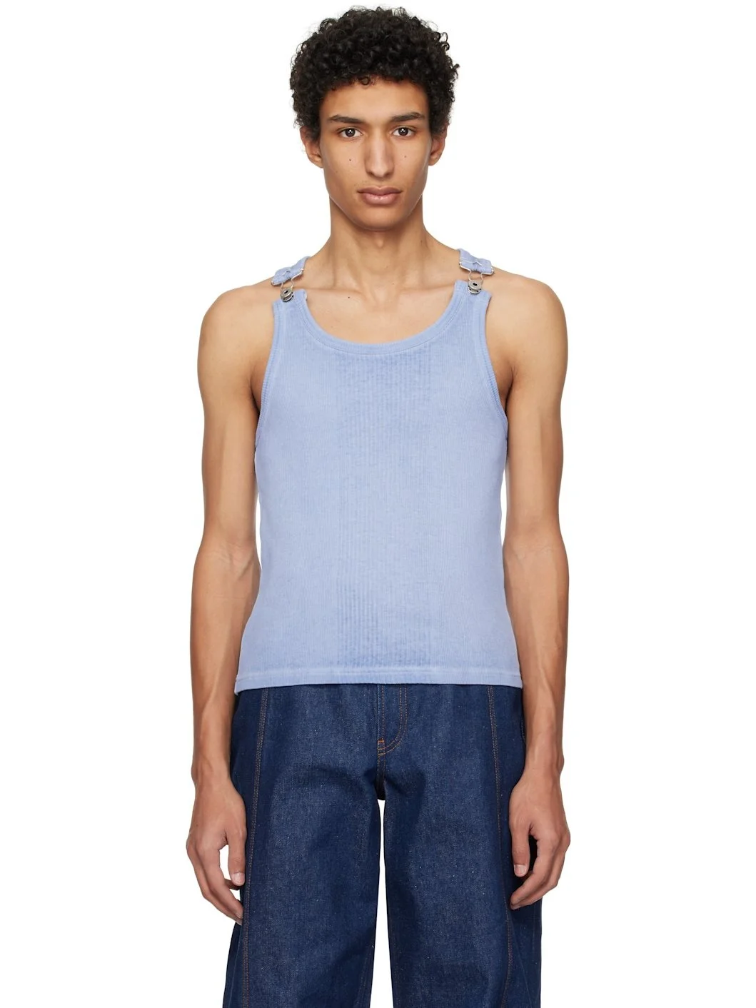 Cotton ribbed jersey tank top. · Scoop neck · Overall fastening at shoulder straps · Locker loop at back collar · Logo-engraved silver-tone hardware Supplier color: Baby blue 100% cotton. Made in Bulgaria 251808M214002