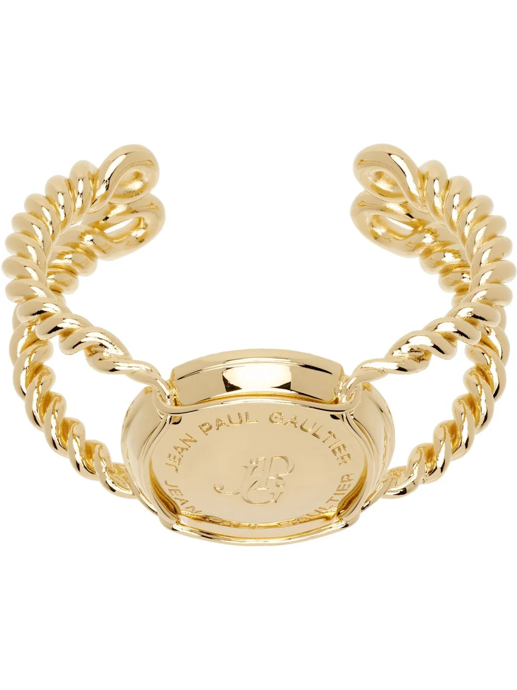 Sculptural open cuff bracelet in gold-tone brass. · Twisted detailing throughout · Logo engraved at face · D2.5" Supplier color: Gold Brass. Made in Italy 252808M142001