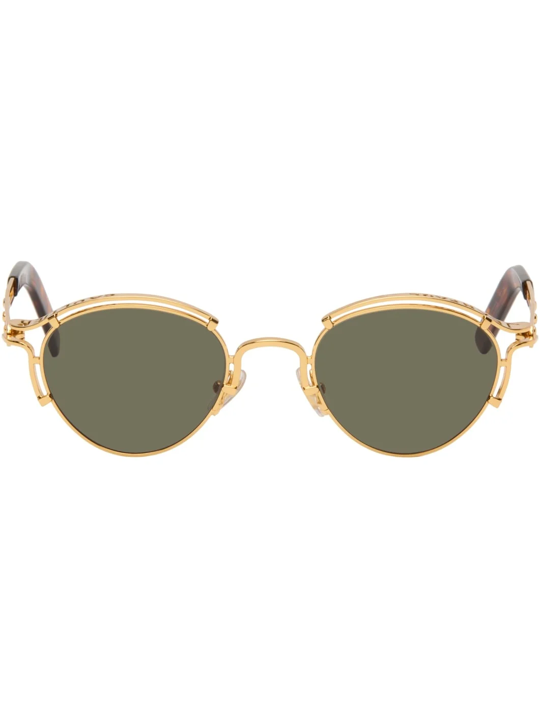 Round metal-frame sunglasses. · Green lenses, category 3 · 100% UVA/UVB protection · Anti-glare coating · Logo cutouts at top rims · Adjustable rubber nose pads · Cutouts at arms · Mazzucchelli acetate temple tips · Includes case · Size: 49.23 145 Supplier color: Gold Metal. Made in France 252808M134010