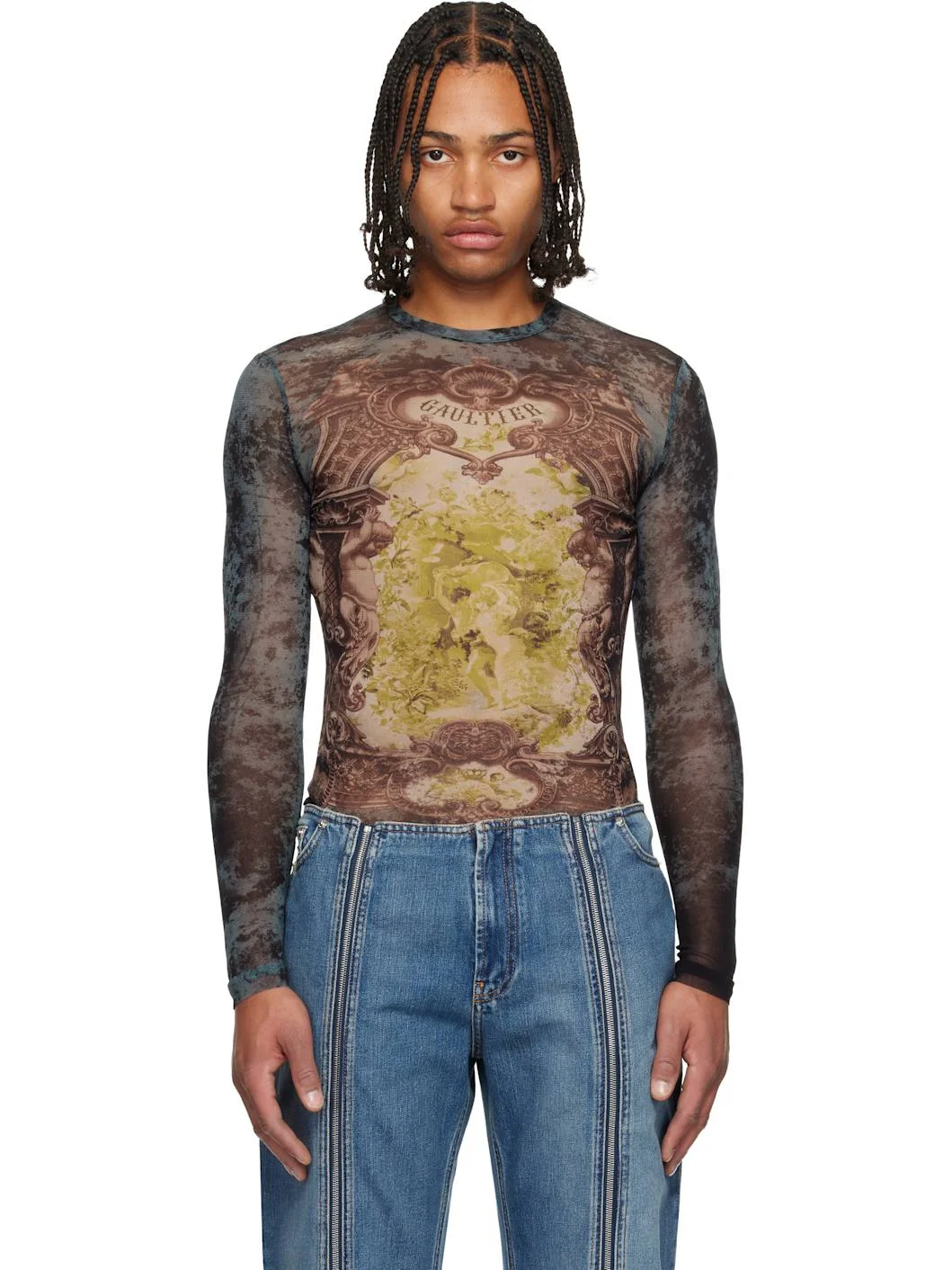 Semi-sheer nylon tulle top. · Graphic pattern printed throughout · Crewneck · Logo printed at chest and back · Locker loop at back collar Supplier color: Black/Vintage 100% polyamide. Made in Italy 252808M213040