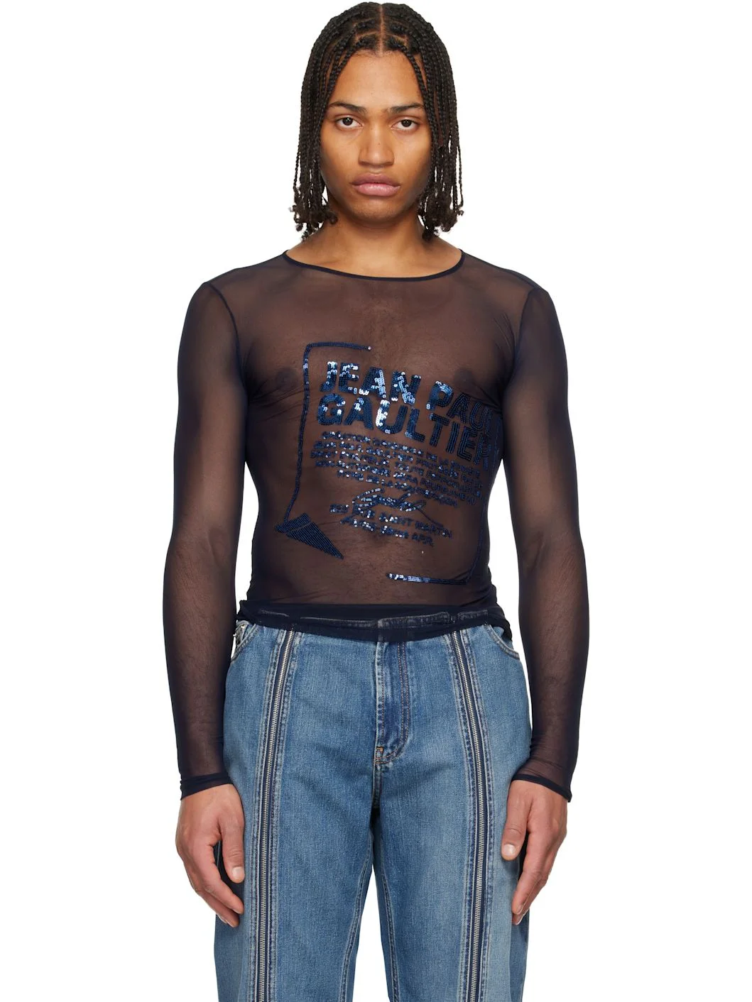 Semi-sheer stretch nylon tulle top. · Round neck · Sequinned logo and text at front · Locker loop at back collar Supplier color: Navy 94% polyamide, 6% elastane. Made in Portugal 252808M213038