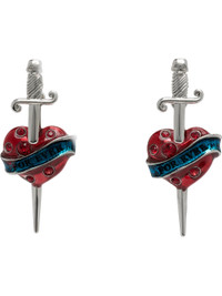 Pair of drop earrings in silver-tone brass. · Engraved text and crystals at face · Enameled graphic in red and blue at drop · Post-stud fastening · H1.75" x W0.75" Part of the Tres Gaultier collection. Supplier color: Silver Brass. Made in Italy 252808M144005