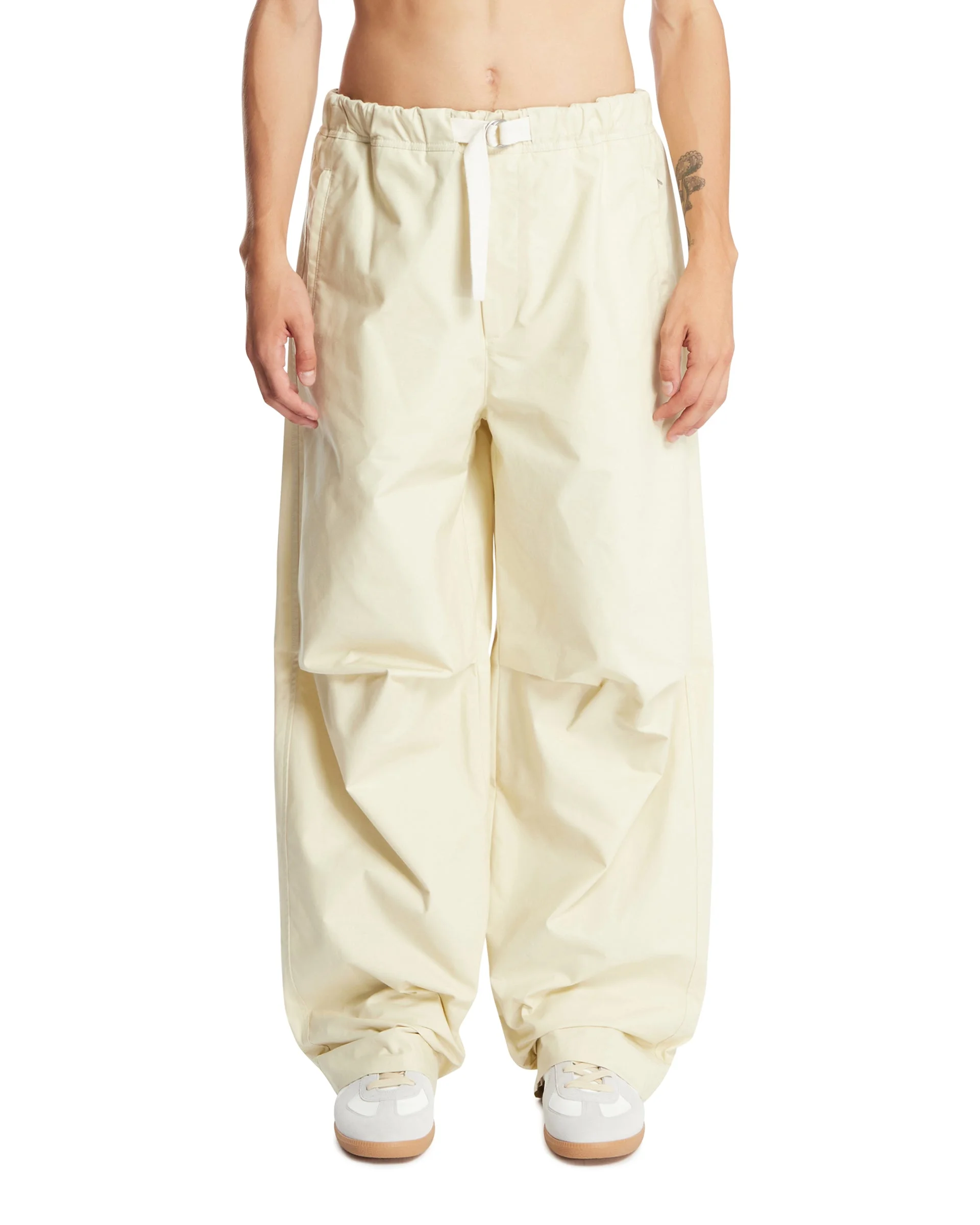 Jil Sander Beige Relaxed Cotton Trousers. Beige cotton,elastic waistband with an integrated belt, wide legs, knee pleats, four-pocket design, relaxed fit. Davide is 185 cm and he is wearing size 48. DETAILS Model: J47KA0268J45296331 Composition: 100% Cotton Made in: ITALY Season: FW25-26