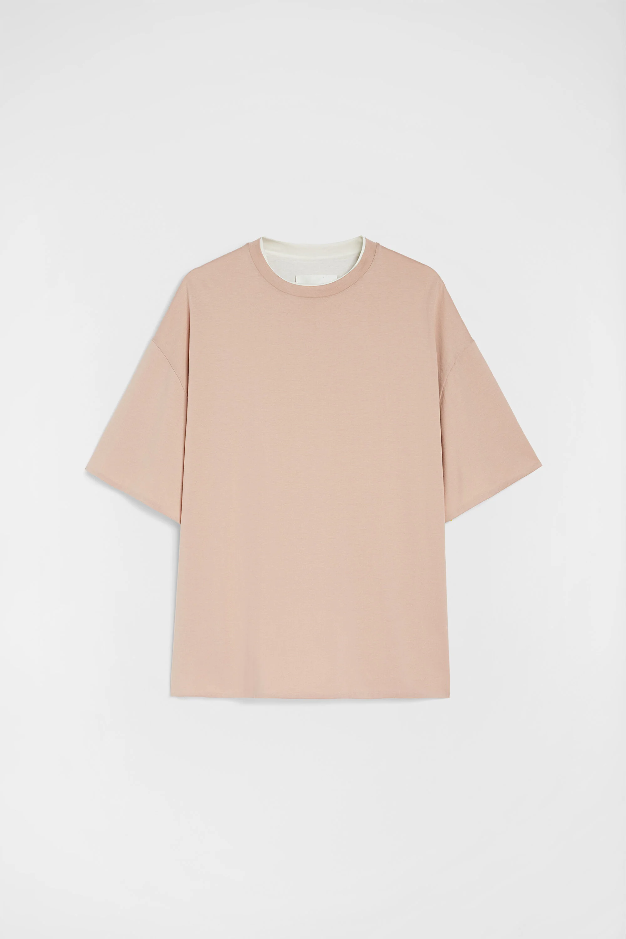 Short-sleeved two-toned cotton t-shirt with double layer effect and side Jil Sander logo tag Details - oversized fit and dropped shoulders - ribbed crew neck - Jil Sander logo tag on side seam - compact cotton jersey - 100% cotton - made in Italy - StyleID: J22GC0223J20325688 Care - dry clean only - iron with care Fit - model is 187cm/6'1" and is wearing a size M - Please note that the physical label of the item will show the international size