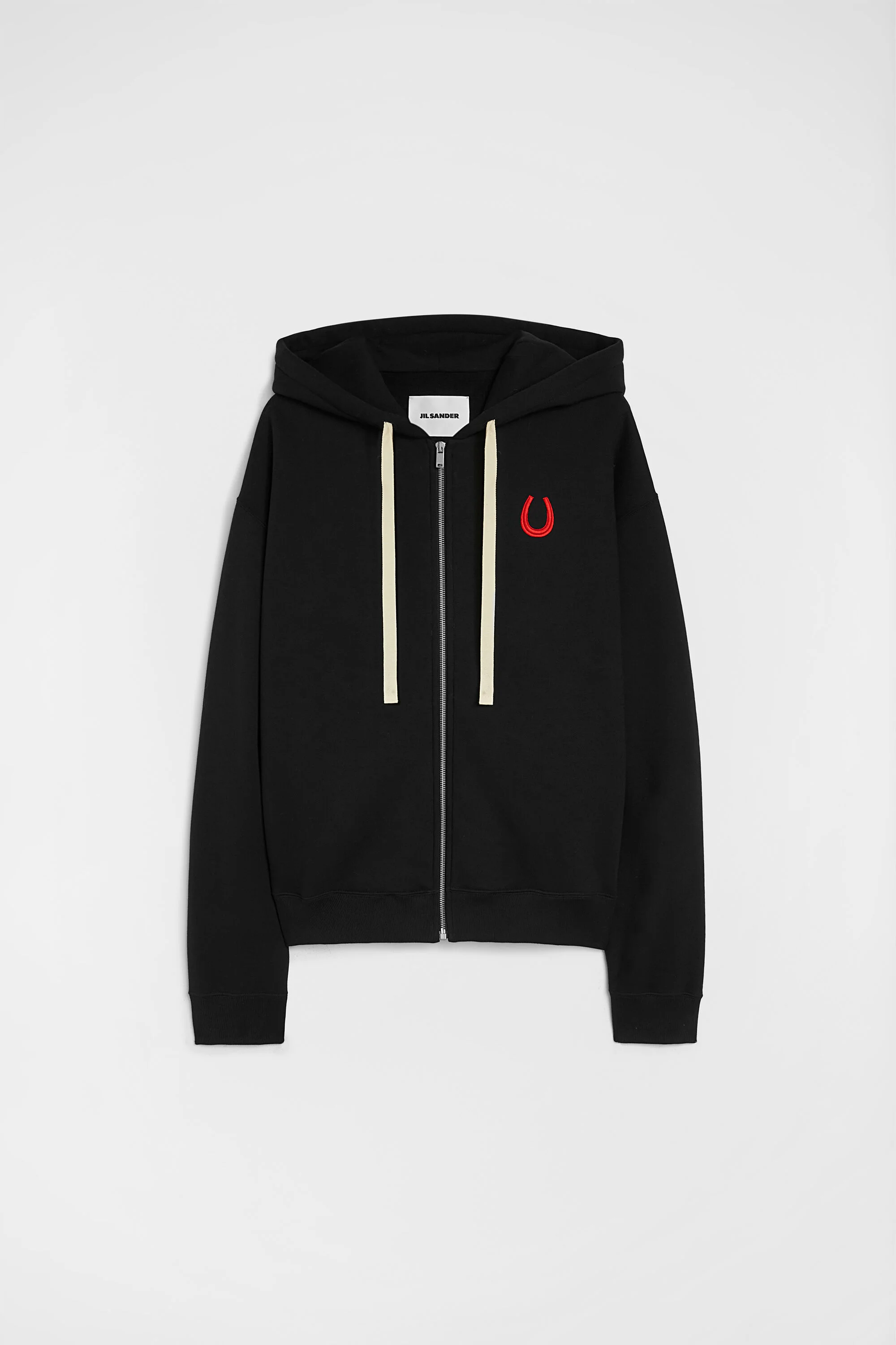 Long-sleeved lightweight cotton terry hooded sweatshirt with front zip and embroidered horseshoe Details - regular fit - dropped shoulders - front zip closure - hood with drawstring - horseshoe embroidered on chest - lightweight cotton terry - 92% cotton 8% elastane-spandex - made in Italy - StyleID: J54HG0001J20128001 Care - dry clean only - iron with care Fit - model is 187cm/6'1" and is wearing a size M - Please note that the physical label of the item will show the international size