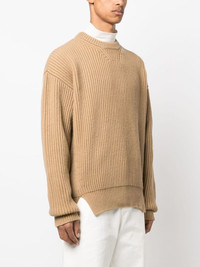 crew-neck ribbed-knit jumper Highlights - Sand beige - Wool - Chunky ribbed knit - Crew neck - Long sleeves - High-low hem - Short side slits Made in Italy Composition Wool 100% SIZE & FIT Model measurements Height 6 ft 2 in(1.87 m) Bust/Chest 38.18 in(97 cm) Hips 36.61 in(93 cm) Waist 29.13 in(74 cm) FittingInformation Designed for an oversized fit, offering additional room throughout Made from a heavyweight non-stretch fabric This piece fits true to size – take your usual size Washing instructions Dry Clean Only