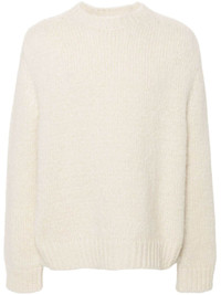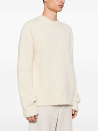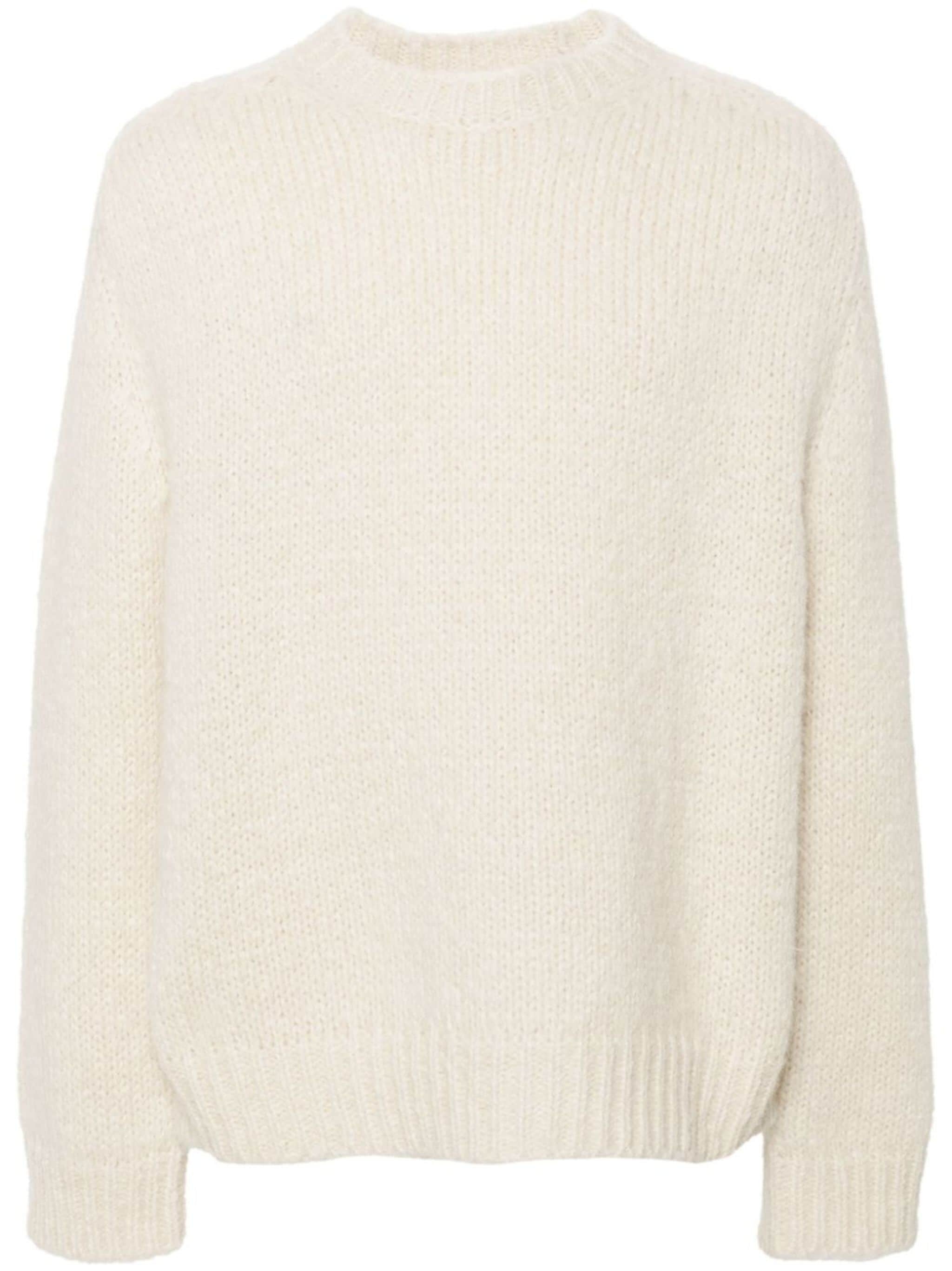 white knitted construction brushed effect crew neck long sleeves ribbed cuffs and hem Size & Fit Model Measurements: Height: 1.85 m Bust/Chest: 99.0 cm Hips: 93.0 cm Waist: 76.0 cm Model wears size 50 Fabric and Care Designer Style ID: J47GP0176J14733 Designer Colour: 105 CHALK Composition: Polyamide 14%, Mohair 43%, Alpaca wool 43% Washing instructions: Dry Clean Only Made in Italy