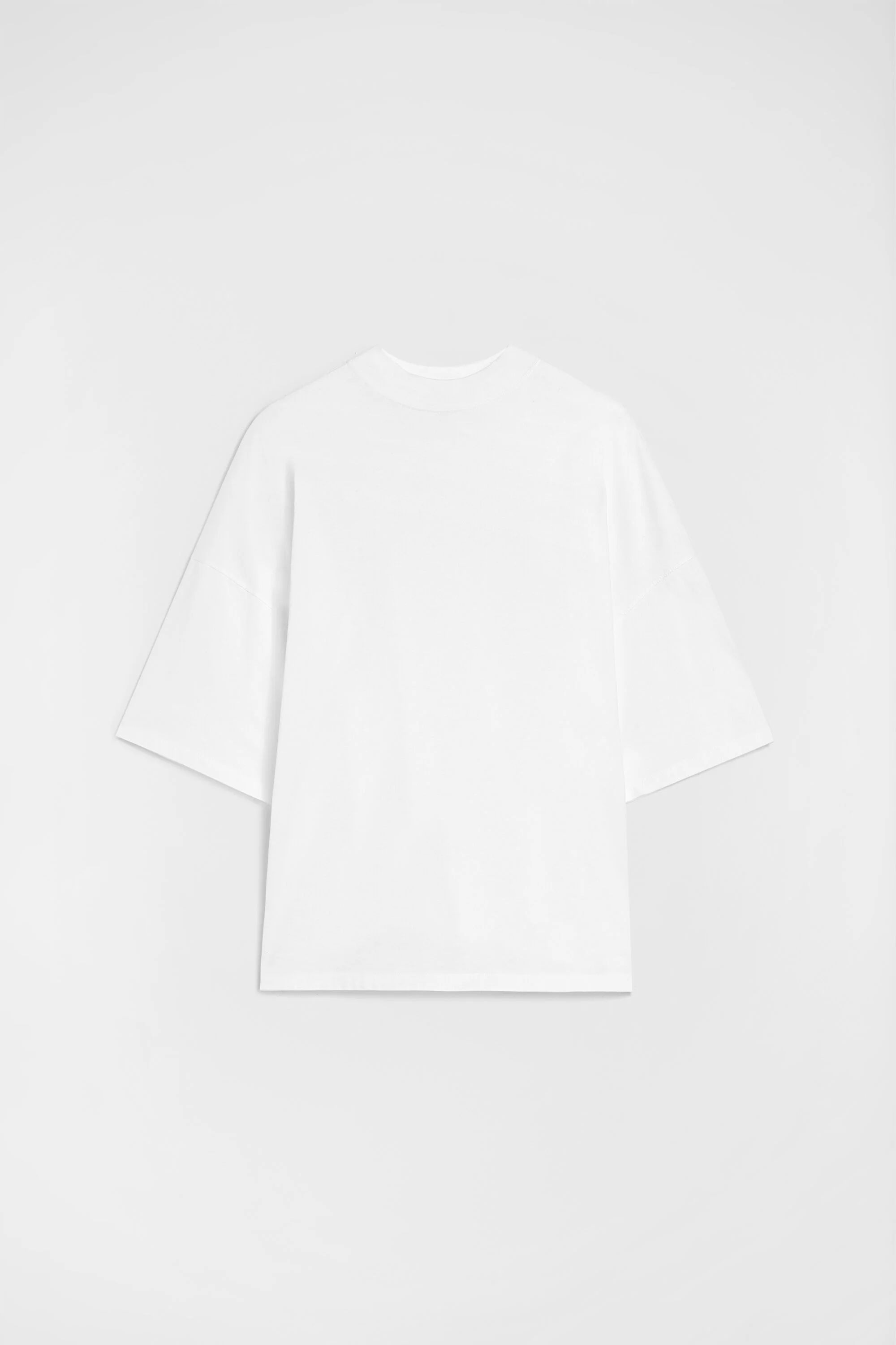 Oversized cotton t-shirt with mock neck and short sleeves Details - oversized fit and boxy shape - we recommend taking one size down - dropped shoulders - ribbed mock neck - short sleeves - 100% cotton - made in Portugal - StyleID: J21GC0005J45084100 Care - hand wash - iron with care Fit - model is 187cm/6'2" and is wearing a size M - Please note that the physical label of the item will show the international size