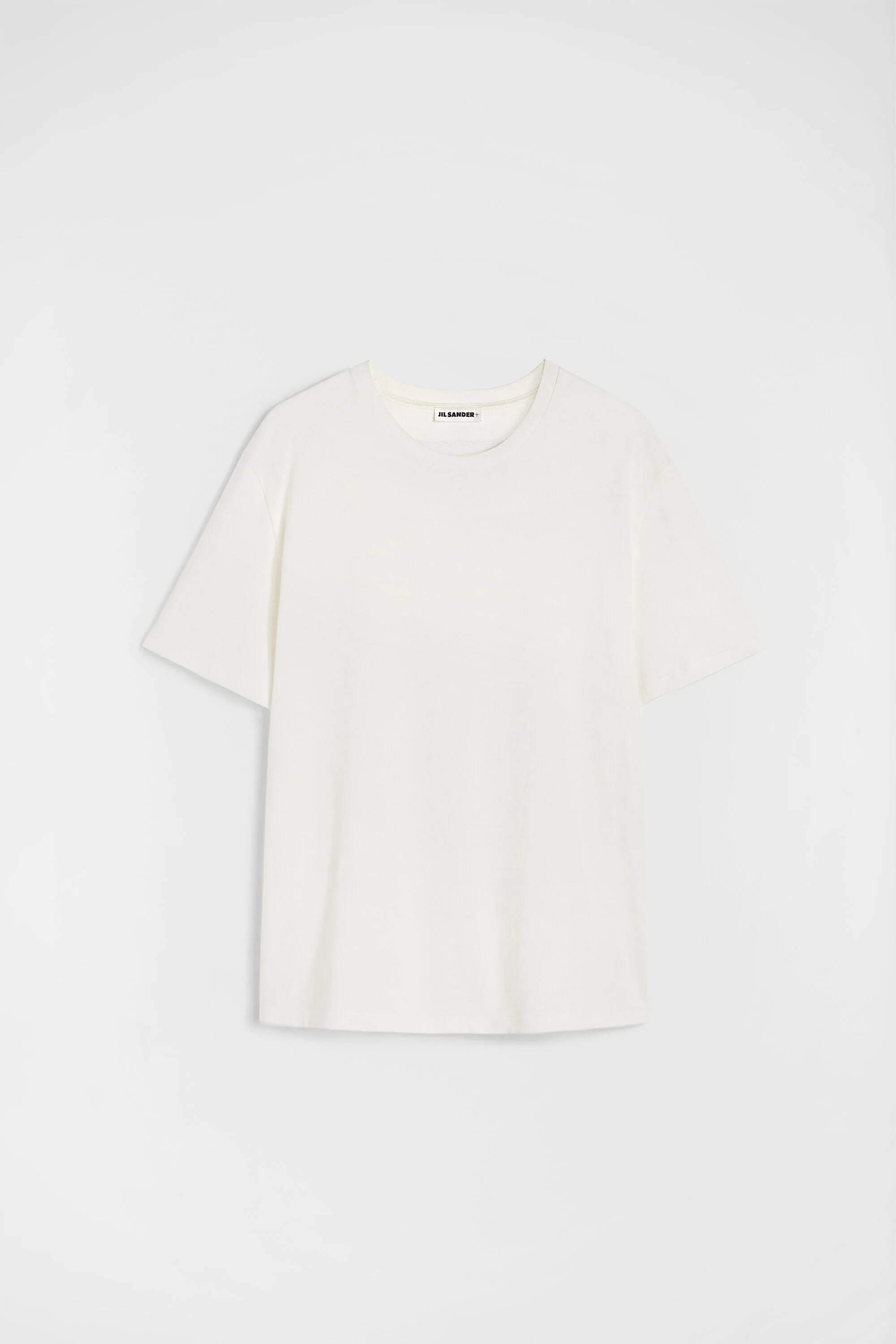 Short-sleeved lightweight compact cotton jersey t-shirt with back leather patch with embossed Jil Sander+ logo Details - relaxed fit - dropped shoulders - back leather patch with embossed Jil Sander+ logo - lightweight compact cotton jersey - 100% cotton - made in Italy - StyleID: J47GC0153J20103102 Care - hand wash - iron with care Fit - model is 187cm/6'1" and is wearing a size M - Please note that the physical label of the item will show the international size