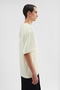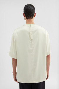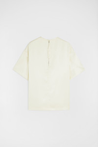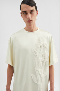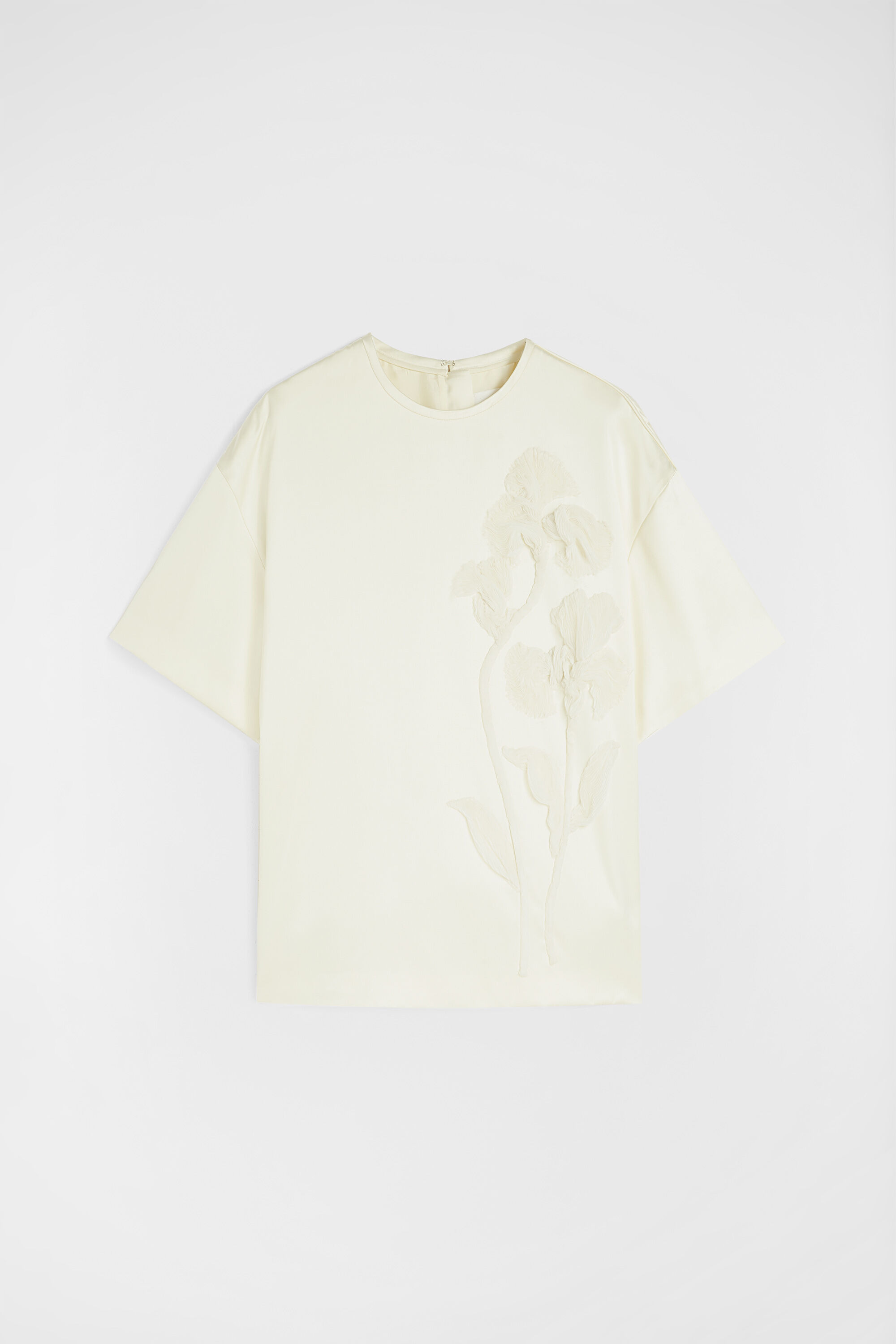 Short-sleeved viscose and silk duchesse t-shirt with flower embroidering Details - oversized fit and boxy shape - dropped shoulders - crew neck - centre-back zip closure with graphic zip puller - viscose lining - double-faced viscose and silk duchesse - 87% viscose-rayon 13% silk - made in Italy - StyleID: J21GC0185J65327109 Care - dry clean only - iron with care Fit - model is 187cm/6'1" and is wearing a size M - Please note that the physical label of the item will show the international size
