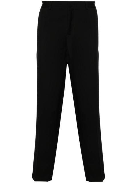 tapered-leg cropped trousers Highlights - Black - Wool - Twill weave - Pressed crease - Rear elasticated waistband - Belt loops - Two side inset pockets - Two rear welt pockets - Concealed front button, hook and zip fastening Made in Italy Composition Outer: Wool 100% Lining: Cotton 100%, Cupro 100% SIZE & FIT Model measurements Height 6 ft 2 in(1.89 m) Bust/Chest 39.76 in(101 cm) Hips 37.4 in(95 cm) Waist 29.92 in(76 cm) FittingInformation Designed for a tapered leg, offering a loose unrestricted fit over the leg with a closer fit towards the ankle The partially elasticated waistband offers increased movement and comfort at the waist Made from a midweight non-stretch fabric This piece fits true to size – take your usual size Washing instructions Dry Clean Only