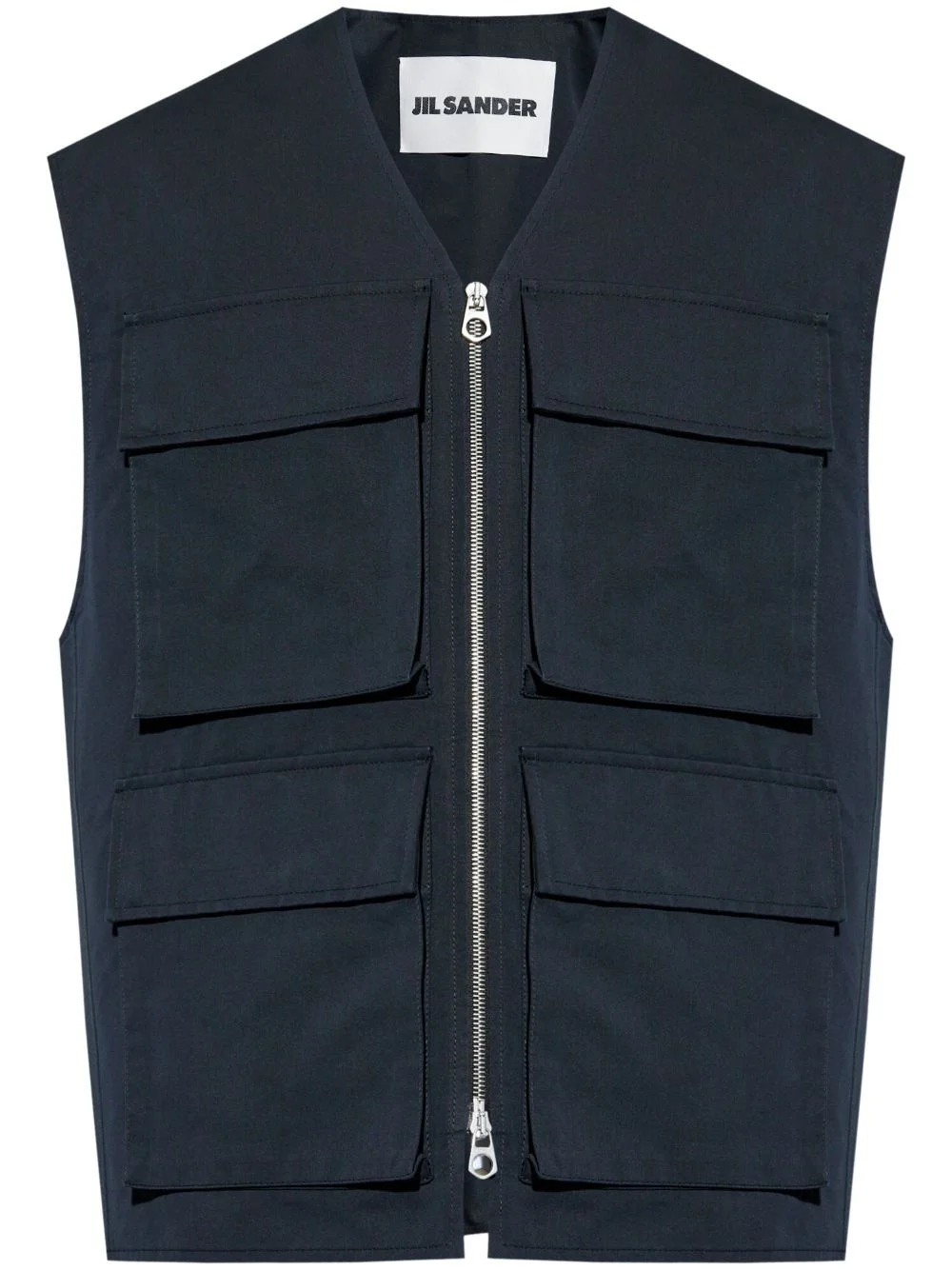 four-pocket gilet Highlights - Black - Front zip fastening - Four front flap pockets - V-neck - Sleeveless Made in Italy Composition Cotton 86%, Silk 14%