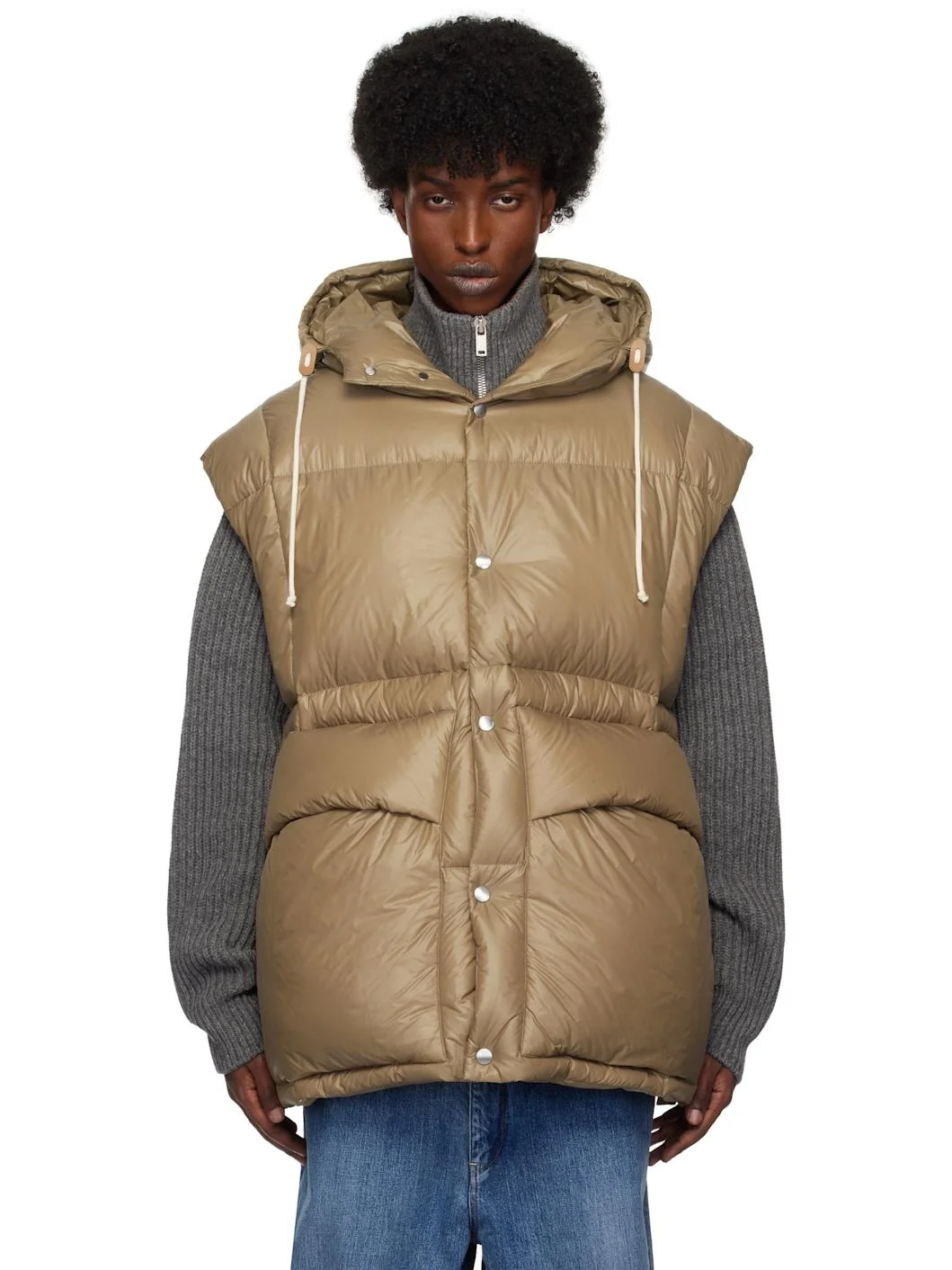 Down-filled and quilted recycled nylon taffeta vest. · Drawstring at hood · Press-stud closure · Flap pockets · Press-stud vent at side seams · Logo patch at back hem · Welt pocket at interior · Nylon satin lining Supplier color: Beaver Fill: 100% recycled goose down. Body: 100% recycled nylon. Made in Italy 242249M178006
