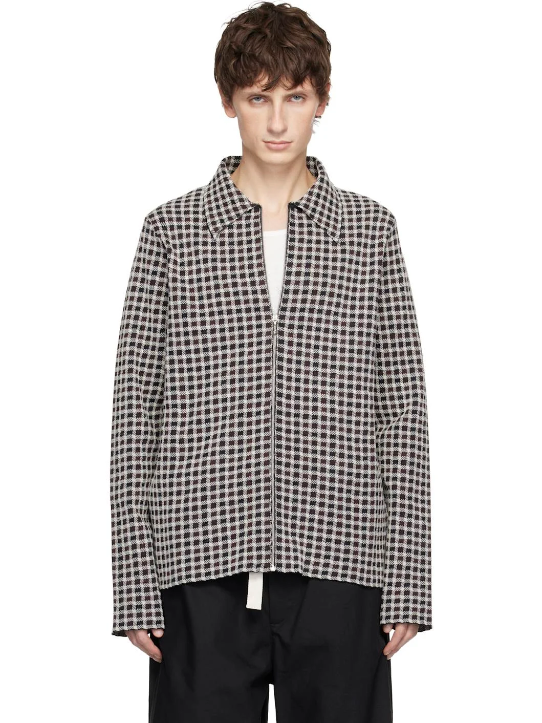 Knit wool-blend shirt. · Check pattern throughout · Spread collar · Zip closure Supplier color: Dark grey 58% polyester, 42% wool. Made in Italy 252249M192015