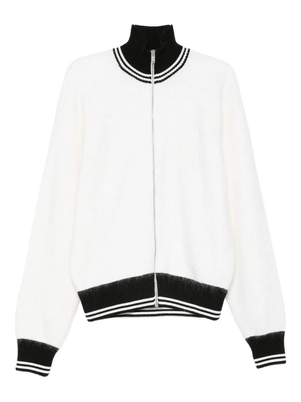 high-neck zip-fastening cardigan Highlights - White - Zip fastening - High neck - Black trims - Long sleeves - Ribbed cuffs Made in Italy Composition Virgin Wool 47%, Polypropylene 23%, Mohair 16%, Polyamide 14% SIZE & FIT Model measurements Height 6 ft 2 in(1.87 m) Bust/Chest 37.79 in(96 cm) Hips 37.79 in(96 cm) Waist 30.31 in(77 cm) Washing instructions Dry Clean Only