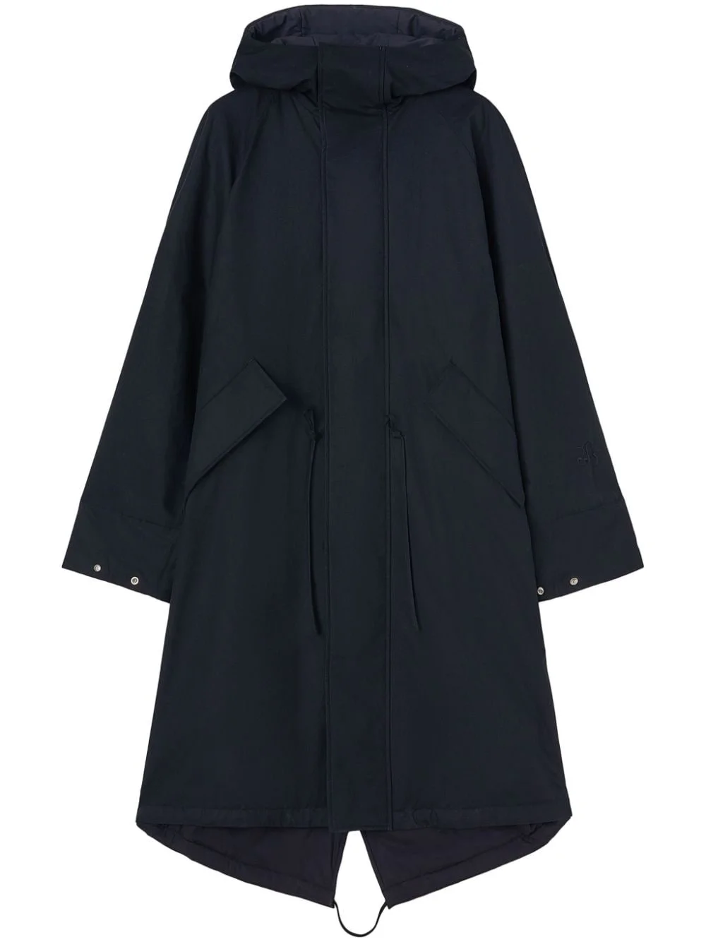 hooded padded parka coat Highlights - Midnight blue - Organic cotton - Classic hood - Funnel neck - Front press-stud and zip fastening - Long raglan sleeves - Drawstring waist - Two side flap pockets - Drawstring hem - Long length Made in Italy Composition Organic Cotton 100%