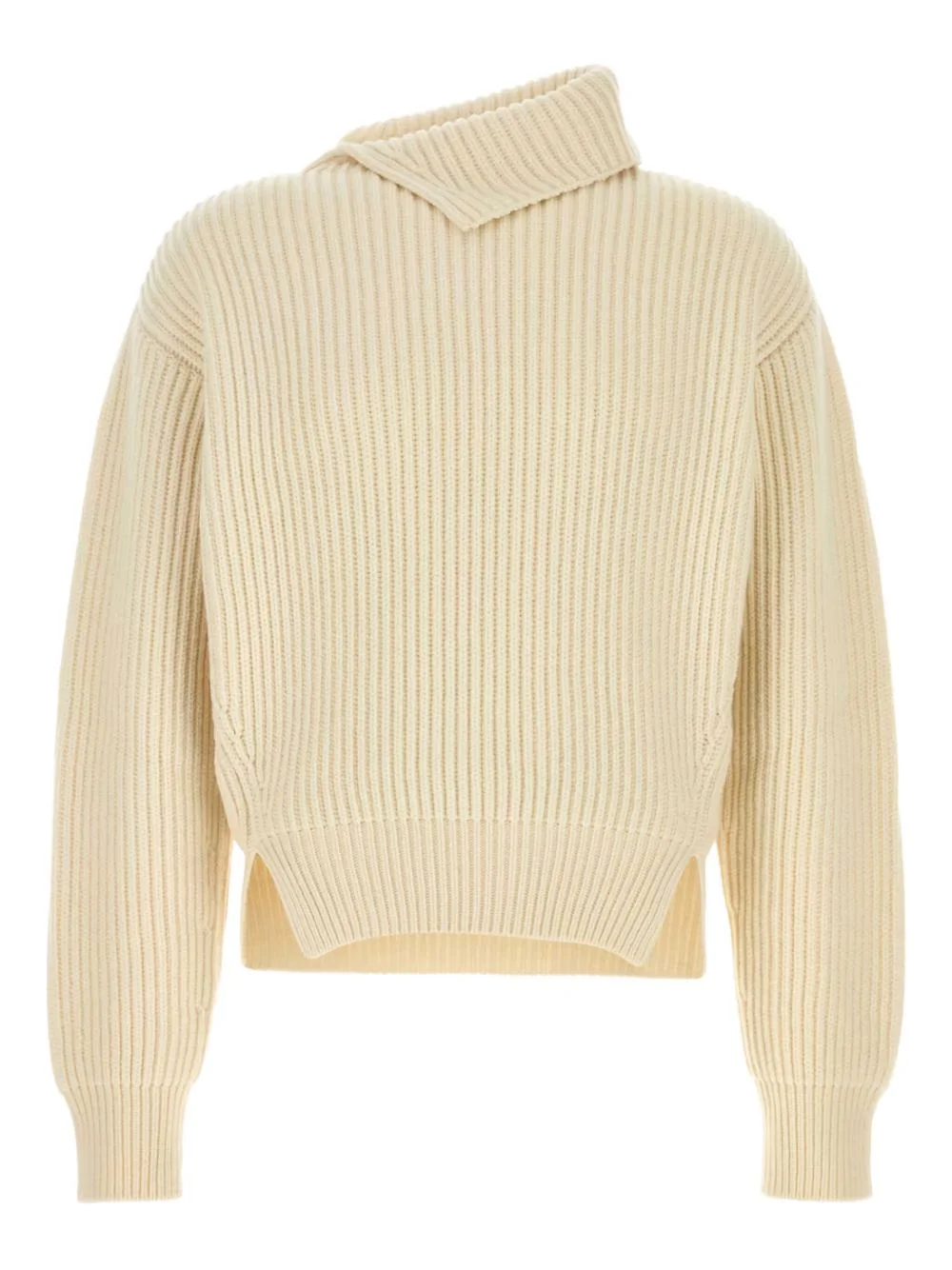 ribbed sweater Highlights - Eggshell - Ribbed knit - Asymmetric collar - Drop shoulders - Long sleeves Made in Italy Composition Wool 100% Washing instructions Read Manufacturer Guidelines