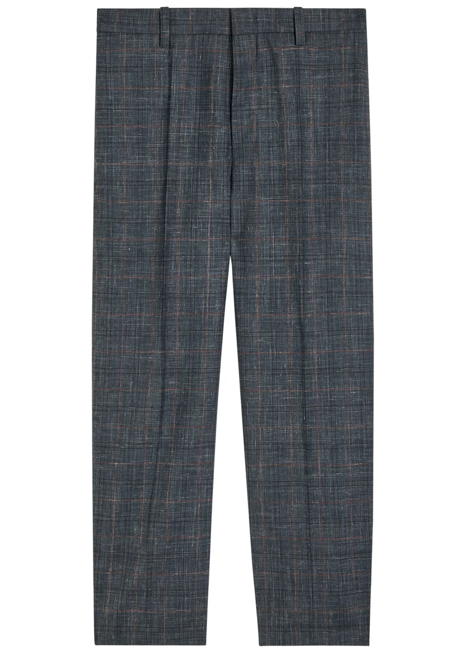 Info & Care Jil Sander wool and linen-blend trousers Checked, belt loops, side slip pockets, pressed crease through legs, two back flap pockets Concealed button, hook and zip fastening at front 83% wool, 17% linen Dry clean Size & Fit Inside leg length: 27 inches/ 68.5cm Midweight Mid-rise fit, relaxed;straight-leg cut Slightly cropped Model is 6'1"/ 185cm and wears a size;IT48
