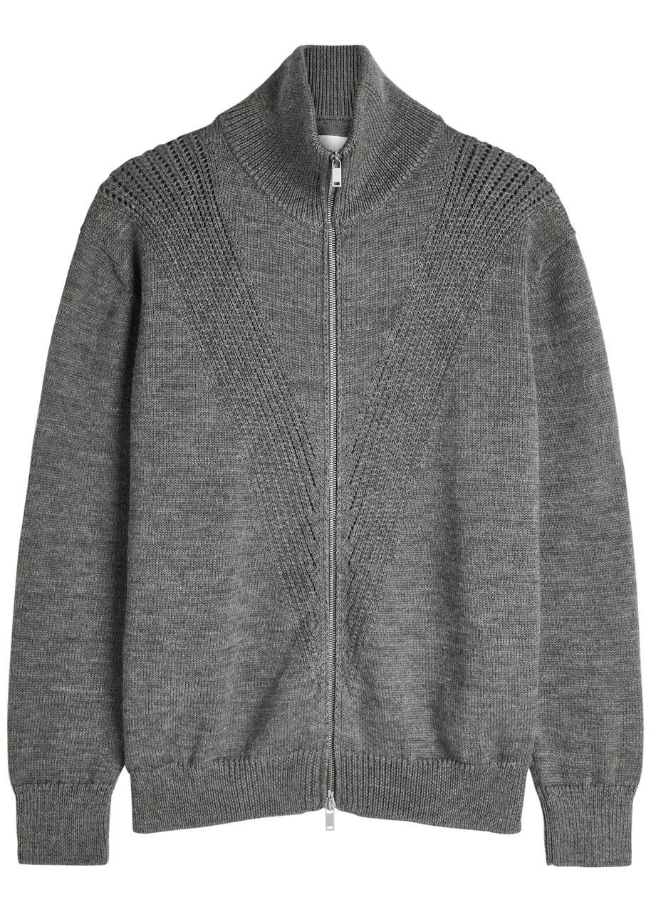 Info & Care Jil Sander;wool cardigan Melange, high-neck, ribbed trims Two-way zip fastening through front 100%;wool; Dry clean; Size & Fit Length shoulder to hem: 26 inches/ 66cm Midweight Relaxed fit Model is 6'1"/ 185cm, chest size 38.5 inches and wears a size;IT48