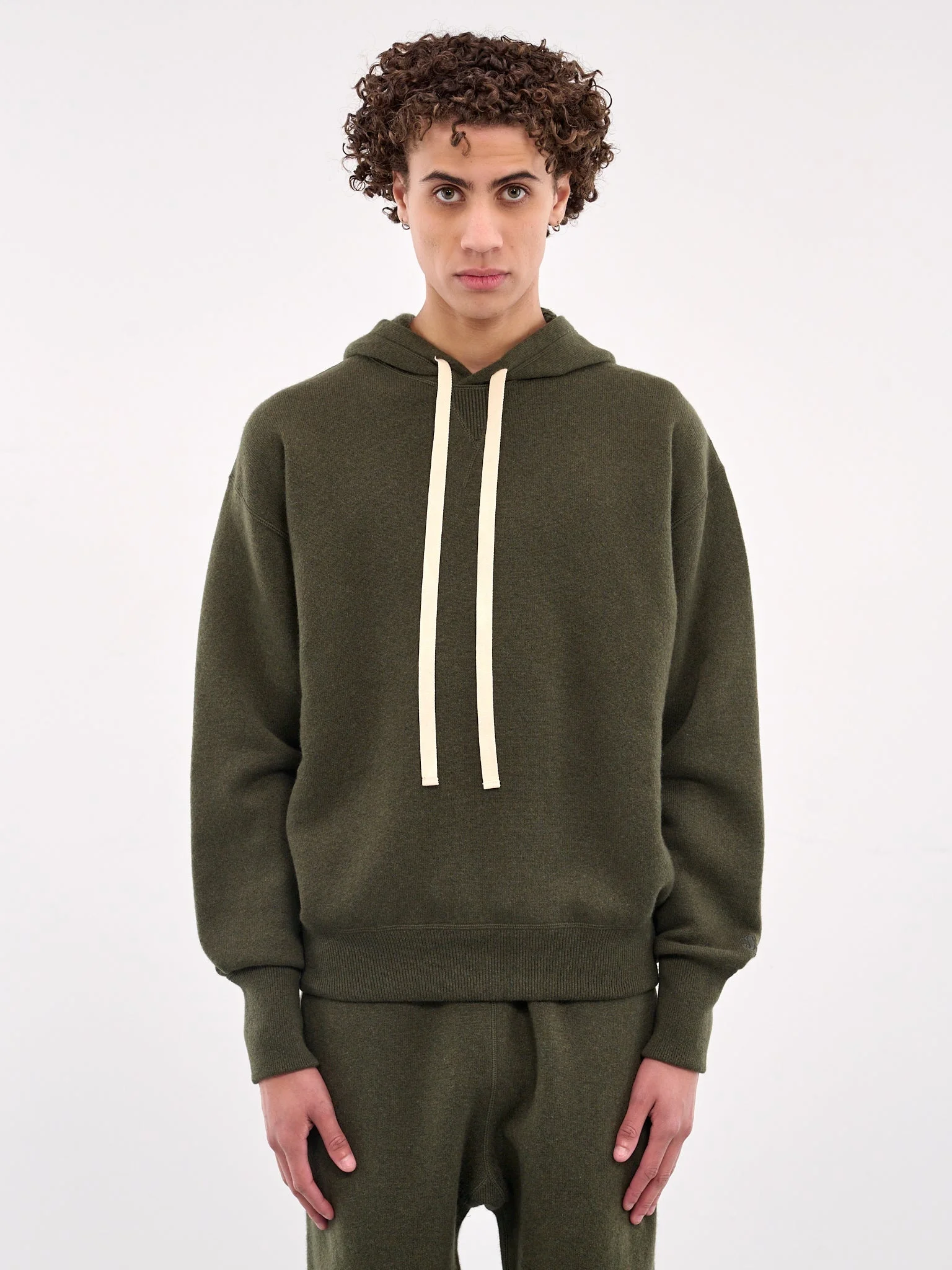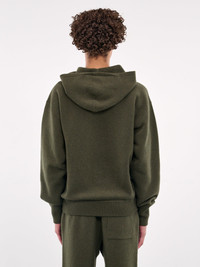 JIL SANDER hoodie in dark green, paneled knit construction, hoodie, adjustable drawstring, dropped shoulders, long sleeves, rib-knit cuffs & hem, straight hem, relaxed fit. Made in Italy Italian Sizing Model is 6'2" wearing size 48. Shoulders: 19" Chest: 38" Waist: 29"