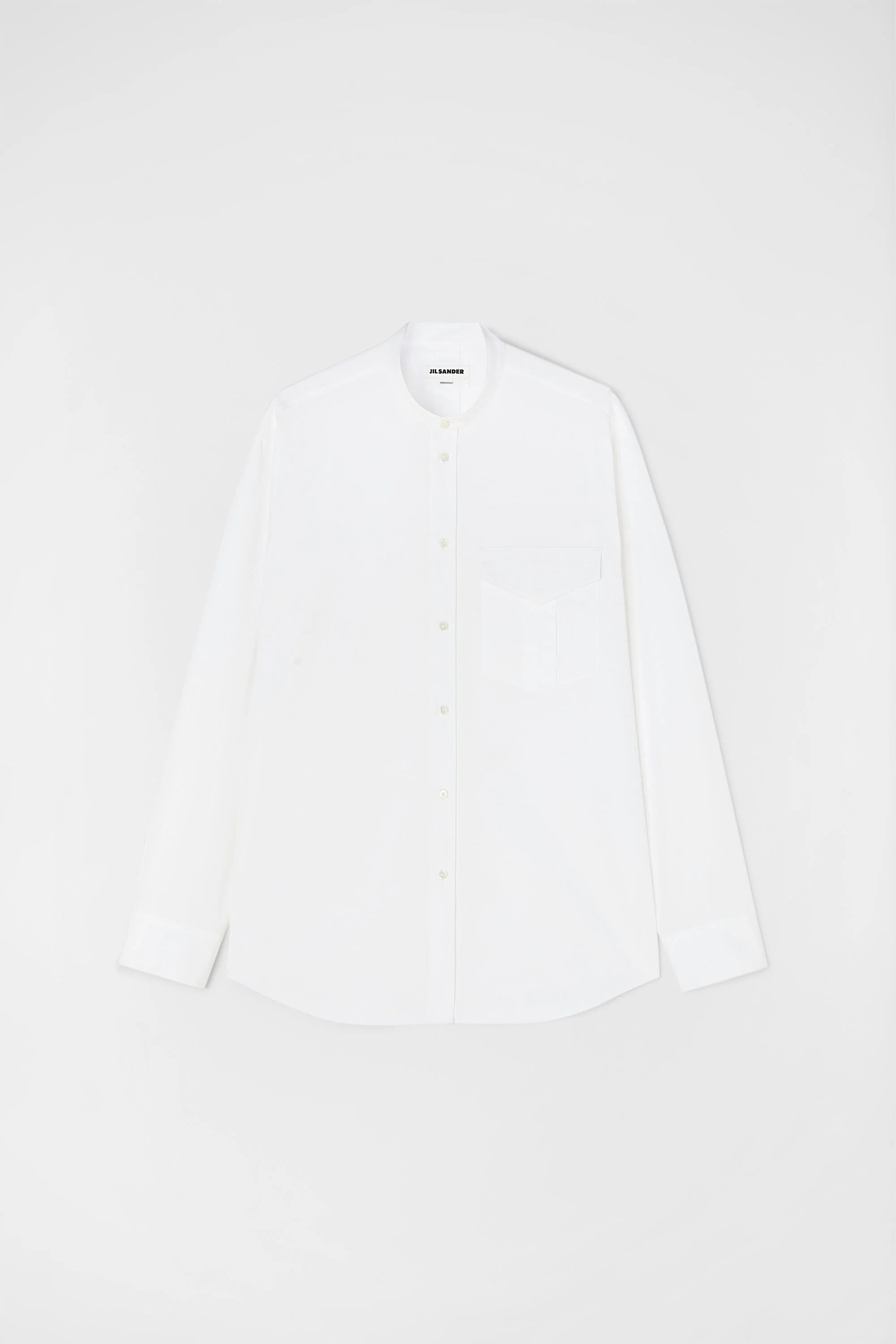 Long-sleeved organic cotton poplin shirt with front patch pocket and embroidered Jil Sander monogram Details - relaxed fit and boxy shape - slightly dropped shoulders - stand collar - centre-front button closure - single patch pocket with pleats and flap - curved hem - embroidered Jil Sander monogram - organic cotton poplin - 100% cotton - made in Italy - StyleID: J24DL0112J45001100 Care - dry clean only - iron with care Fit - model is 187cm/6'1" and is wearing a collar size 40